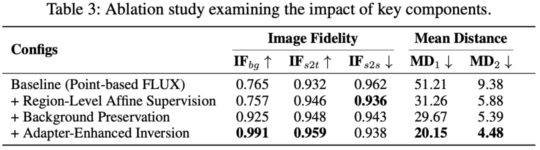 同时,消融实验中使用的多项量化指标也证实了 DragFlow 的各组件都是不可或缺且协同增效的: