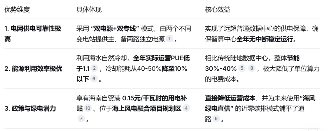海南海底智算中心的电力优势,并不只是靠“电多”,更多是省和补,主要体现在供电可靠、能耗极低以及未来绿电潜力三个层面。下表从这几个维度进行了具体对比: