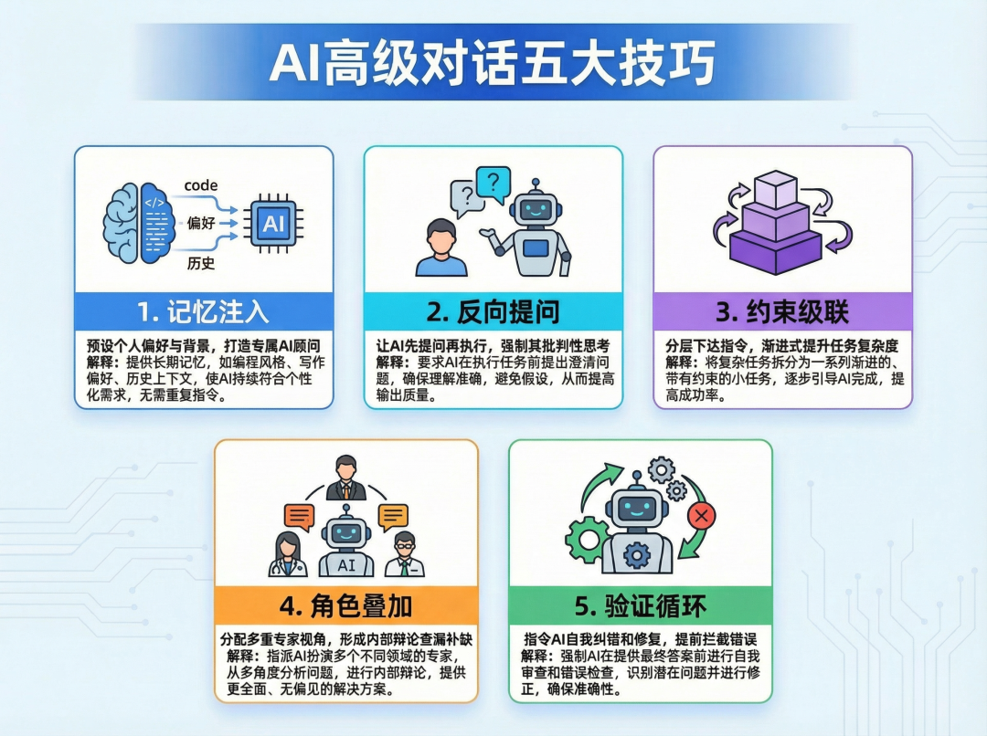 不要急着让AI干活,先让它问你问题。比如你想分析客户流失数据,可以说:“在你帮我之前,先问我5个关于数据集、业务背景和预期目标的澄清问题。”这个技巧的精妙之处在于,它迫使模型在执行前先进行批判性思考,大幅减少胡说八道的概率。