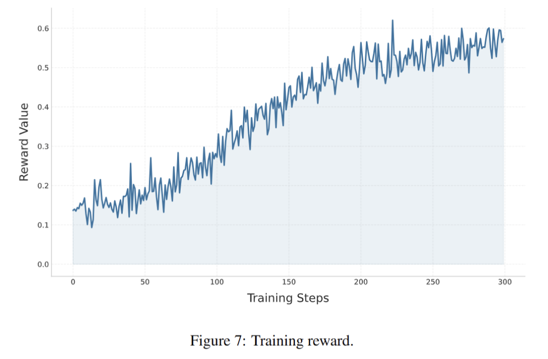 通过分析强化学习(RL)阶段的平均奖励曲线,验证级联训练范式的收敛性与有效性。实验结果显示,RL阶段进行150步训练后,模型平均奖励由初始的0.15提升至0.55,并趋于稳定,表明“Seed-SFT→动态能力感知SFT→RL”的级联训练范式能够持续优化模型策略,实现性能稳步提升,验证了该训练框架的合理性与高效性。