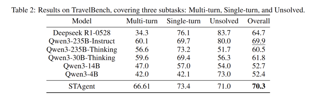 实验分为在线真实环境与离线静态基准两类场景。在线真实环境中,采用自采的1000条高质量查询数据(涵盖5种任务类型、7个难度等级),每个查询重复推理8次取平均值,由Gemini-3-flash作为裁判从总体、摘要、推理、展示四项维度评估胜率。结果显示,STAgent相较于Qwen3-30B-Thinking优势显著,总体胜率达77.5%,远超对比模型的21.6%,其中摘要维度胜率81.9%、展示维度胜率73.7%,体现出在真实场景下的优质交互能力。离线静态基准则采用TravelBench基准的Multi-turn(多轮)、Single-turn(单轮)、Unsolvable(无解)三子集,在温度0.7的设置下重复测试3次取平均,由GPT-4模拟用户、Gemini担任裁判打分。最终STAgent以70.33分的总成绩,超越DeepSeek-R1(64.7分)与Qwen3-235B-Thinking(60.5分),其中Multi-turn多轮对话子任务以66.61分斩获第一,验证了其在复杂时空任务中的核心竞争力。