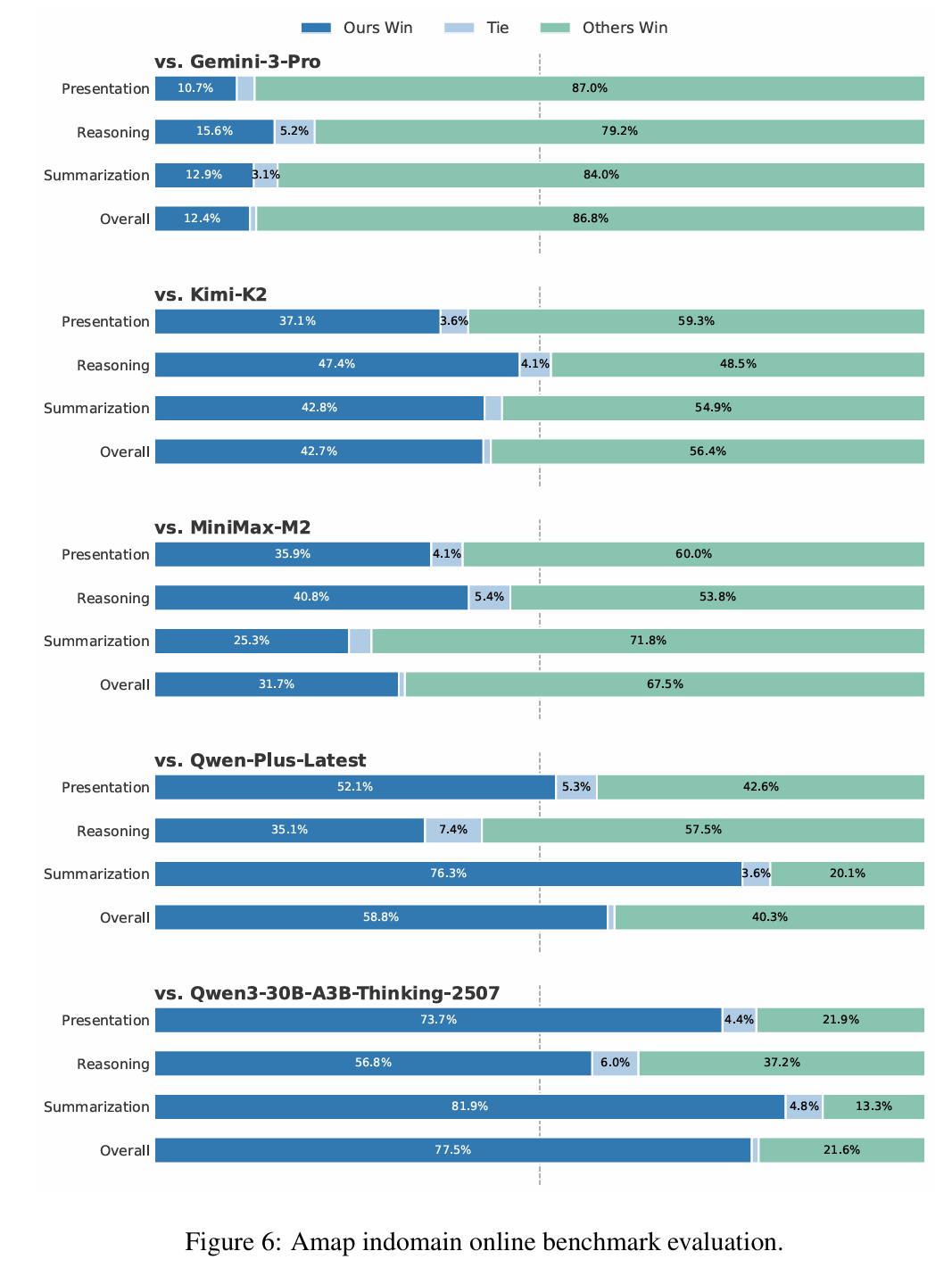 根据任务类型动态分配权重(复杂规划侧重推理,;信息检索侧重保真,;咨询解释侧重呈现,),同时通过严格比对工具输出与模型响应中的关键事实(时间、价格、距离、坐标等),对存在幻觉的轨迹直接判,奖励。通过RL阶段专攻SFT模型未完全掌握的高难度任务(如多约束跨城自驾规划、长尾POI精准搜索),实现性能边界的持续突破。