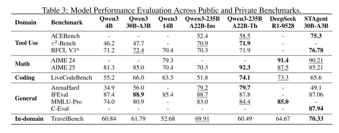 在SFT阶段仅混入不超过5%的通用指令跟随数据(如基础逻辑推理、简单自然语言理解任务),核心聚焦时空领域专用数据训练,避免通用能力被稀释。最终基于Qwen3-30B-A3B(MoE架构)的STAgent模型,在TravelBench时空基准上实现8.5pp的整体提升,其中多轮对话任务得分66.61分(位列第一),单轮任务73.4分,无解任务71.0分;同时在通用基准中表现亮眼:工具使用类ACEBench达75.3分,数学推理AIME24/25分别为90.21/85.21分,编码任务LiveCodeBench 65.6分,综合能力MMLU-Pro、C-Eval等均保持甚至超越初始模型水平,真正实现“时空专用深耕而不偏科”的核心优势。