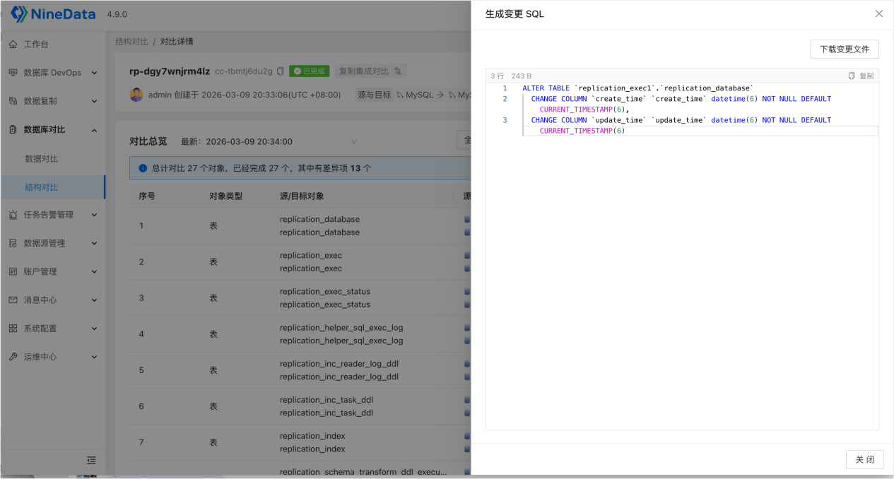 NineData 数据对比功能,是面向数据迁移、数据同步、容灾校验场景的标准化一致性校验能力,从结构对比、全量数据对比、差异自动修复三个维度,提供可量化、可追溯、可落地的一致性保障。