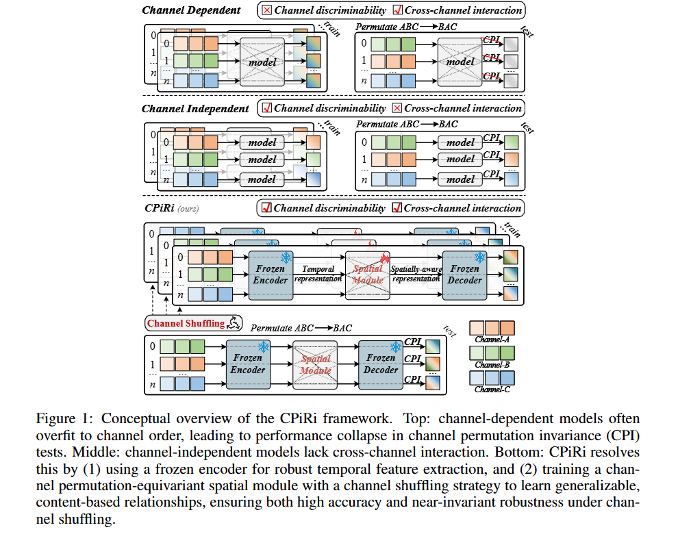 TL; DR:CPiRi enables channel-permutation-invariant MTSF by combining frozen temporal encoding with lightweight spatial attention trained via channel shuffling, achieving SOTA accuracy with zero performance drop under dynamic sensor changes.