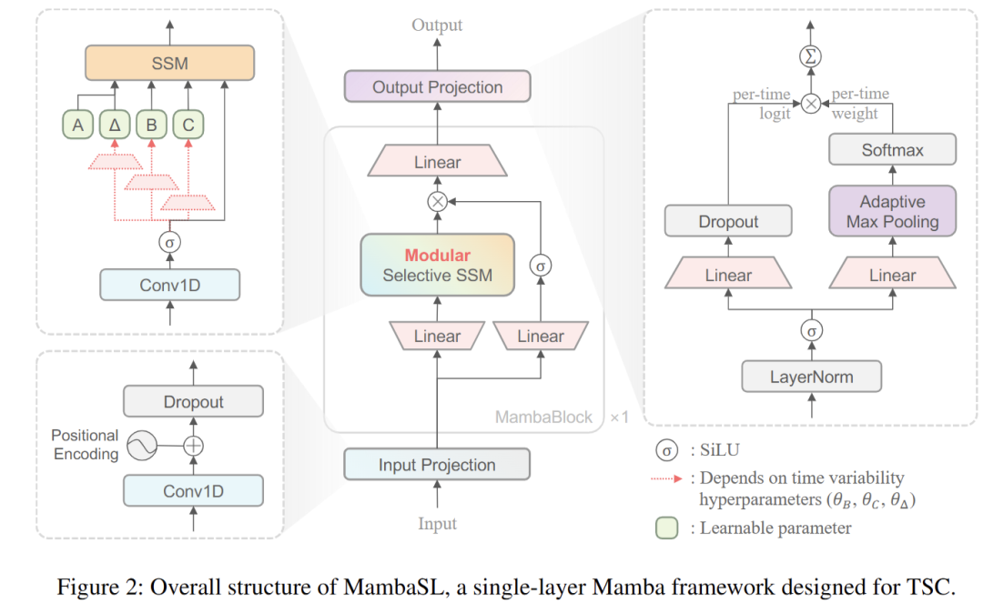 关键词:modular selective SSM, multi-head adaptive pooling, skip connection, single-layer Mamba, time series classification