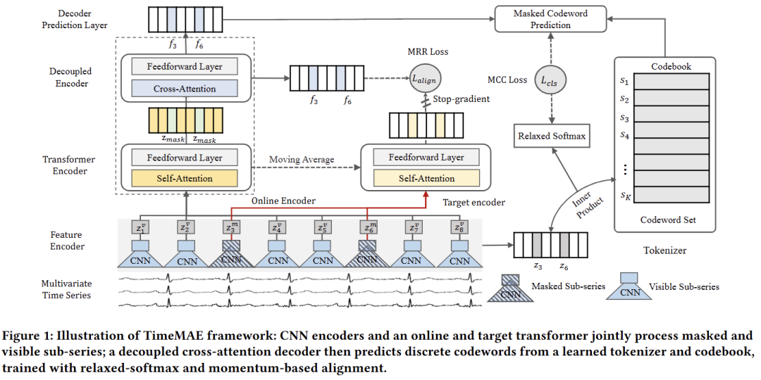 摘要:从未标记的时间序列中学习可迁移的表征对于提高数据稀缺情况下的分类性能至关重要。现有的自监督方法通常在点级别进行操作,并依赖单向编码,这导致语义密度低,且预训练与下游优化之间存在不匹配。在本文中,本文提出了TimeMAE,这是一种自监督框架,通过语义单元提升和解耦表征学习来重新构建时间序列的掩码建模。TimeMAE不再对单个时间步进行建模,而是将时间序列分割为非重叠的子序列,以形成语义丰富的单元,从而在降低计算成本的同时实现更具信息量的掩码重建。为了解决掩码带来的表征差异,本文设计了一种解耦的掩码自编码器,对可见区域和掩码区域分别进行编码,避免了主编码器中出现人工掩码标记。为了指导预训练,本文引入了两个互补的目标:掩码码字分类(通过学习到的分词器将子序列语义离散化)和掩码表征回归(通过动量更新的目标编码器对齐连续表征)。在五个数据集上的大量实验表明,TimeMAE优于有竞争力的基线模型,尤其是在标签稀缺场景和迁移学习场景中。本文的代码可在https://github.com/Mingyue-Cheng/TimeMAE公开获取。