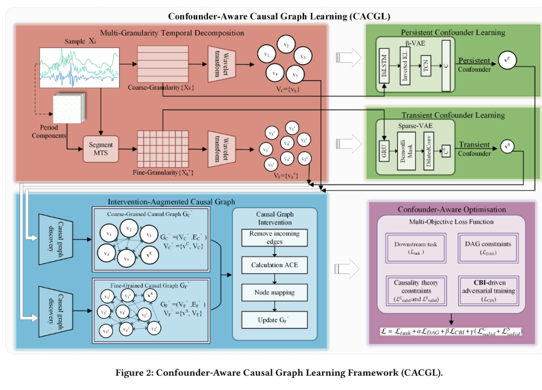 摘要:基于多元时间序列(MTS)分析的图因其变量间复杂的非线性关系和时间依赖性而受到关注。为了增强观测性MTS数据的可解释性,因果图学习已成为一种主流方法。然而,现有的因果图方法缺乏处理未观测混杂因素和动态因果关系的机制,这限制了它们在MTS场景中的适用性。为了克服这些局限性,本文提出了一种新颖的框架——混杂因素感知因果图学习(CACGL),该框架对具有多尺度效应的未观测混杂因素进行建模,并捕捉变量间随时间变化的因果关系。首先,CACGL采用多粒度因果架构,将在整个序列上对变量级因果关系进行建模的粗粒度图与捕捉局部片段内跨变量因果相互作用的细粒度图相结合,明确地分离出时间异质性依赖。其次,本文设计了一个基于层次化变分自编码器(VAE)的模块,为两种未观测混杂因素构建受外生性约束的代理变量:符合因果充分性标准的持续性混杂因素和短暂性混杂因素。第三,提出了一种偏误感知优化策略,通过混杂偏误指数(CBI)来量化未观测混杂,该指数将残余混杂效应转化为对抗性信号,以增强基于图神经网络(GNN)的因果不变性。此外,还设计了多目标损失函数来提高因果关系的稳定性,同时由CBI驱动的对抗性学习减轻了下游任务中的混杂偏误。在真实世界数据集上的实验表明,CACGL在MTS的因果图发现方面实现了最先进的性能,同时对时间异质性的未观测混杂进行了建模,并提高了可解释性。