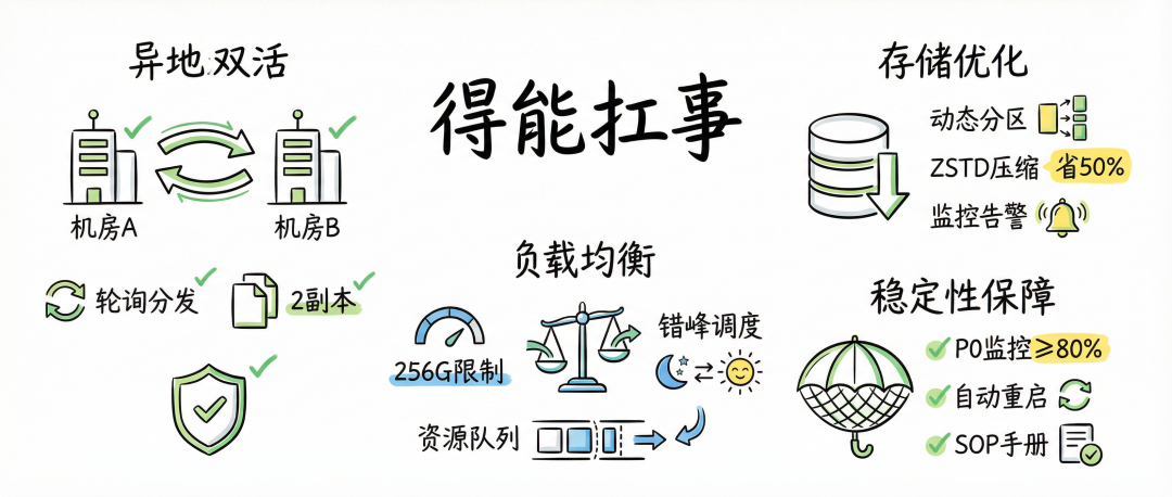建表时配置 location 参数,确保每张表在双机房各保留 2 个副本——任何一个机房挂掉,另一个能无缝接管,真正实现跨机房容灾与双活。