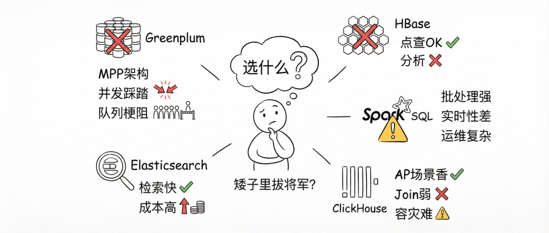 那换 HBase?NoNoNo,HBase 擅长的是点查和随机读写,分析型查询不是它的强项。