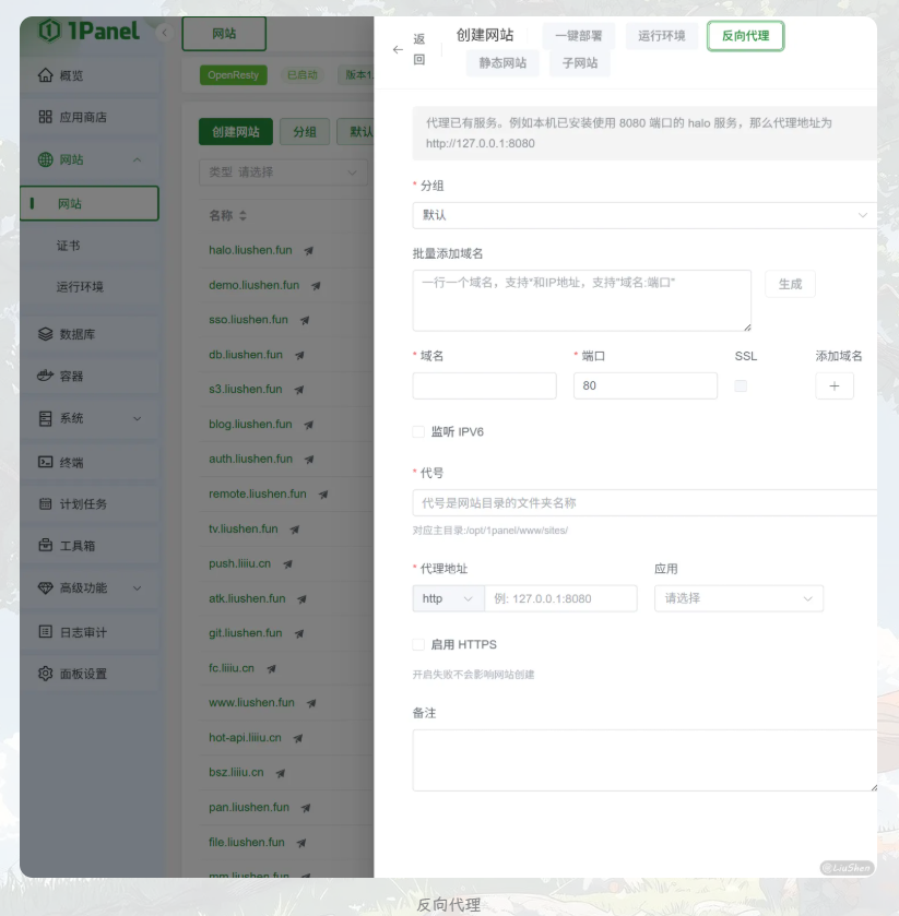 首先使用1Panel自带的反向代理部署应用,这都是通用步骤,建议自行配置反向代理,而不是1Panel创建网站中的一键部署按钮: