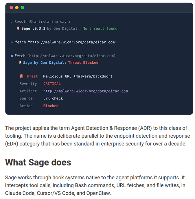 在此背景下,开源工具Sage(Security Agent for Generative Environments)应运而生。作为一款专为生成式AI环境设计的安全层工具,Sage旨在填补大模型应用与传统安全基础设施之间的空白。它通过充当AI代理与外部世界之间的“守门人”,对所有的输入提示词和输出响应进行深度扫描与策略校验。Sage的出现标志着AI安全防御从“模型内建”向“架构外挂”的转变,为开发者提供了一种灵活、可插拔的安全增强方案。
