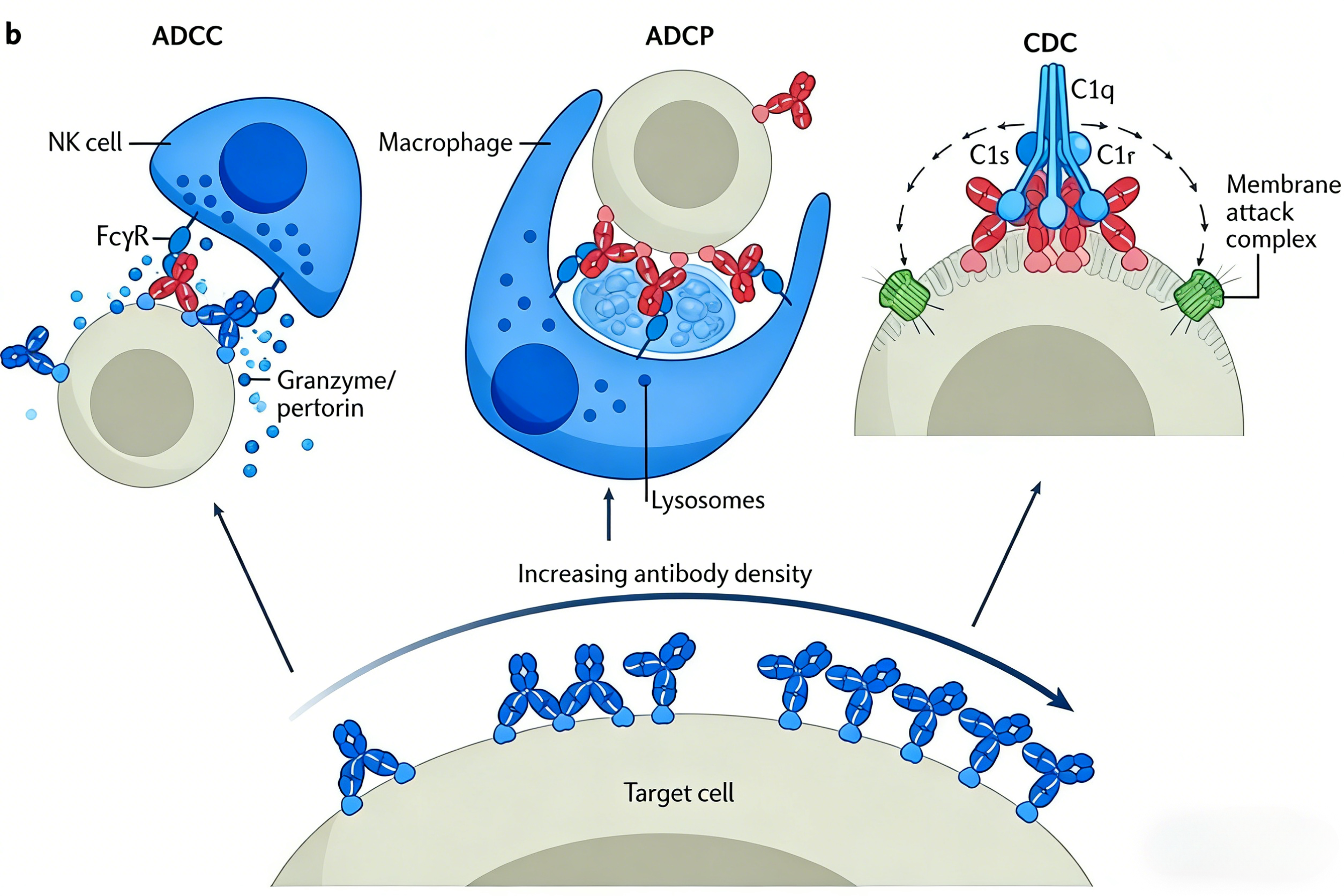 抗体依赖的细胞介导的细胞毒性作用(ADCC)及抗体依赖的细胞吞噬作用(ADCP)是Fc段介导的效应功能。抗体结合靶细胞表面抗原后,其Fc段与自然杀伤(NK)细胞或巨噬细胞表面的Fcγ受体结合,激活效应细胞杀伤靶细胞。该机制是抗肿瘤抗体(如利妥昔单抗、曲妥珠单抗)发挥疗效的核心途径之一。
