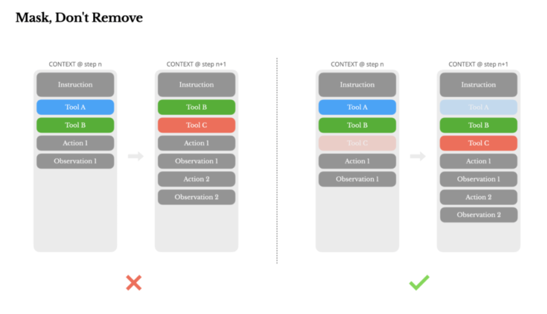 Manus引入了上下文感知状态机来管理工具的可用性,它并不是真正的移除工具,而是在解码阶段屏蔽了相应的token logits,从而阻止选择某些动作。