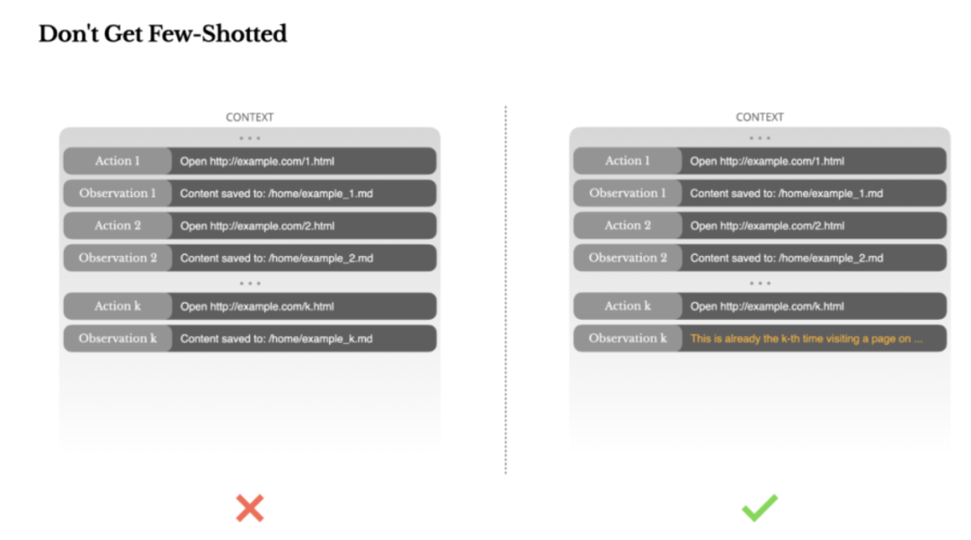 LLM是出色的模仿者,会模仿上下文中的行为模式,如果上下文中充斥着大量相似的动作和观察时,模型会延续这一模式,使得模型不再最优。大量重复类似的操作,会导致过度泛化,甚至产生幻觉。