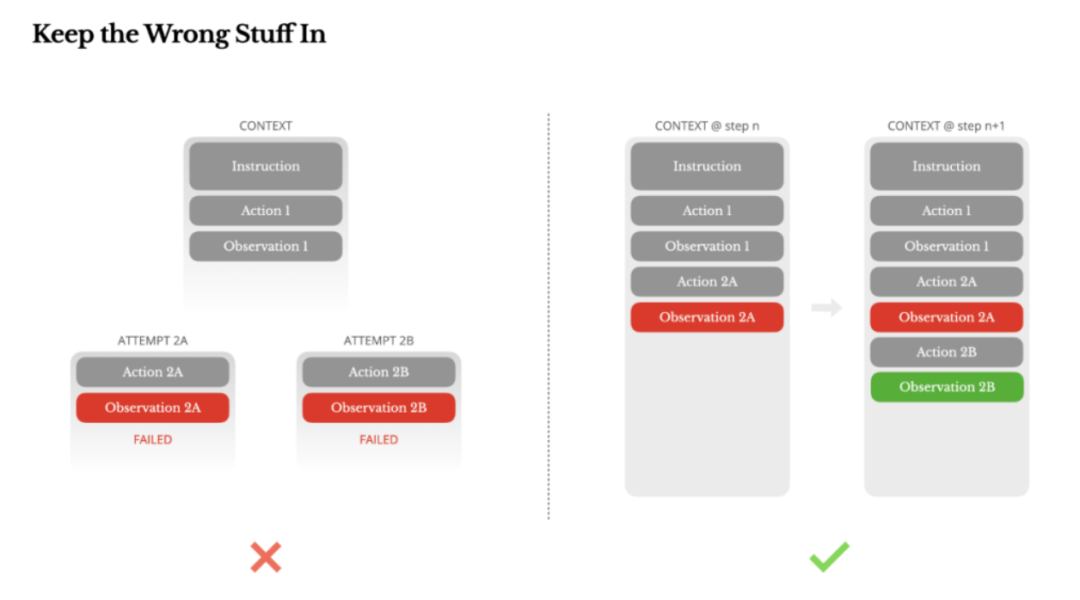 Manus的实践是,把走错的路保留在上下文中,当模型看到一次失败的行动,以及对应的堆栈跟踪,他会潜移默化的更新内部信息,降低重蹈覆辙的概率。
