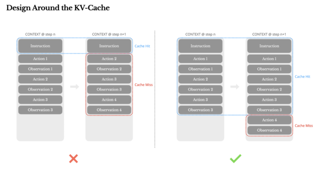 2、让上下文保持追加:避免修改之前的动作或观察结果,确保序列化是确定性的,有时序列化成json顺序不稳定,会破坏缓存。
