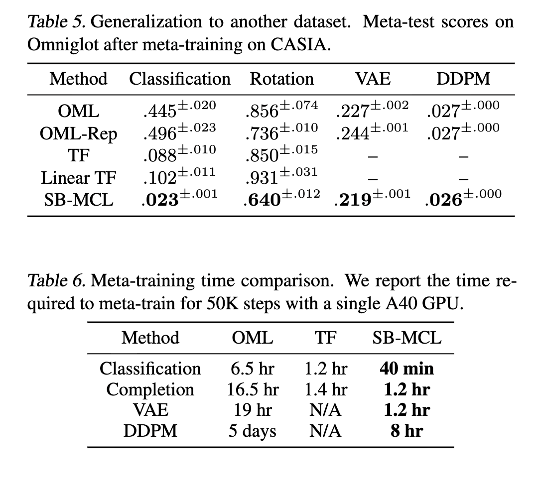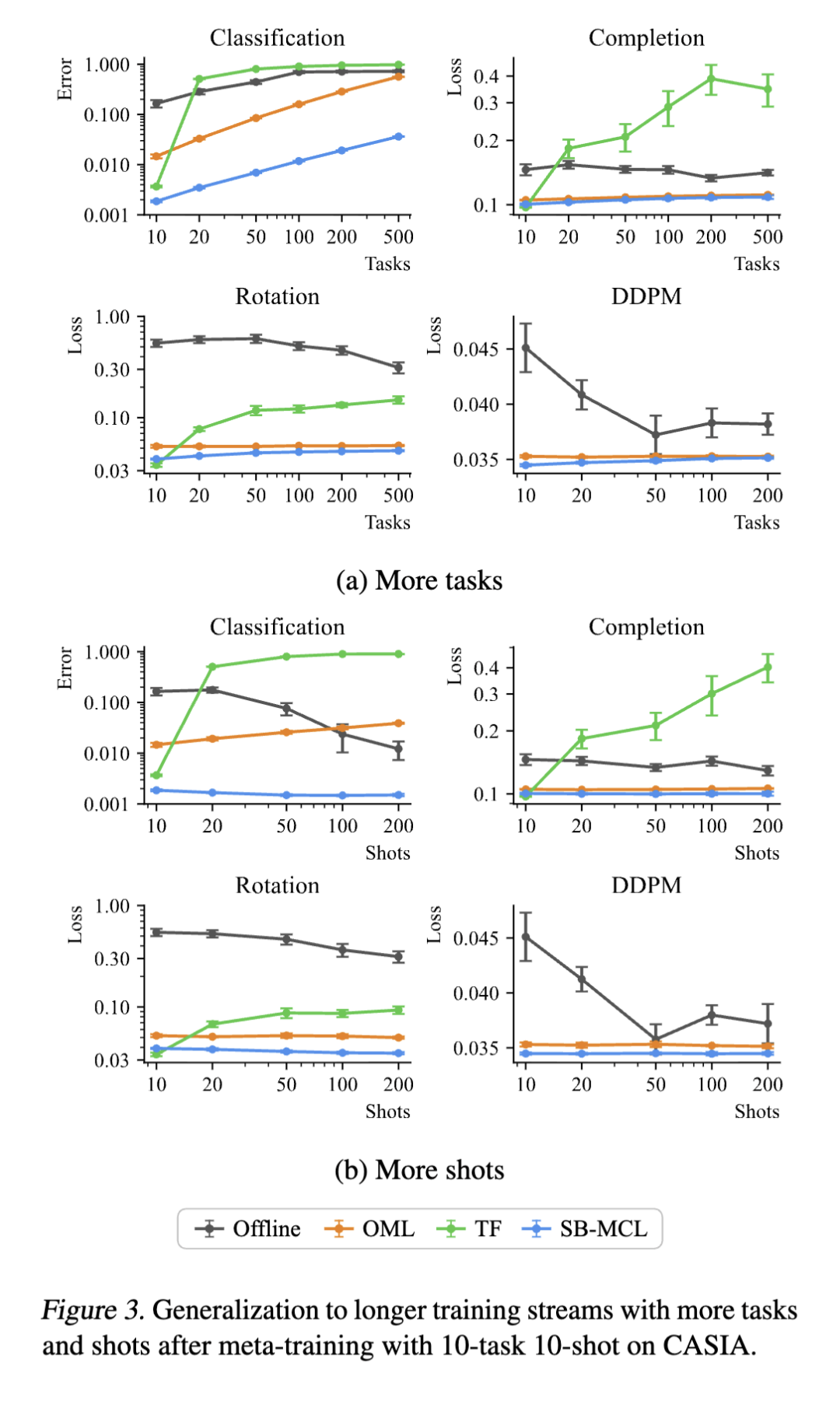 更强的泛化能力 当在更长的训练流(图 3)或不同数据集(表 5)上进行元测试时,SB-MCL 的得分均显著优于所有基线方法。尤为突出的是,TF 的性能因长度泛化能力差而急剧下降——这是 Transformer 广为人知的局限性(Anil 等,2022)。另一有趣现象是:如图 3b 所示,即使任务数量不变、仅增加每个任务的样本数(shots),TF 与 OML 的性能仍可能出现下降。这看似违反直觉,因为为每个任务提供更多信息理应有益。然而在基于 SGD 的 MCL 中,更长的训练流意味着更多 SGD 更新步数,反而可能加剧遗忘;而 TF 更因长度泛化失败导致性能急剧恶化。相比之下,SB-MCL 家族在“多样本”(many-shot)设定下展现出卓越的鲁棒性:随着样本数增加,其性能甚至略有提升。该现象与我们的理论框架高度一致——由于后验属于具有固定维数充分统计量的指数族分布,在任务数不变的前提下增加样本数,仅会提升变分后验的估计精度,而不会引发遗忘。