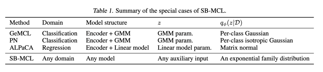 若干先前工作可被视为 SB-MCL 在特定领域下的特例。我们在表 1 中总结了其关键特性,并在下文给出高层描述。