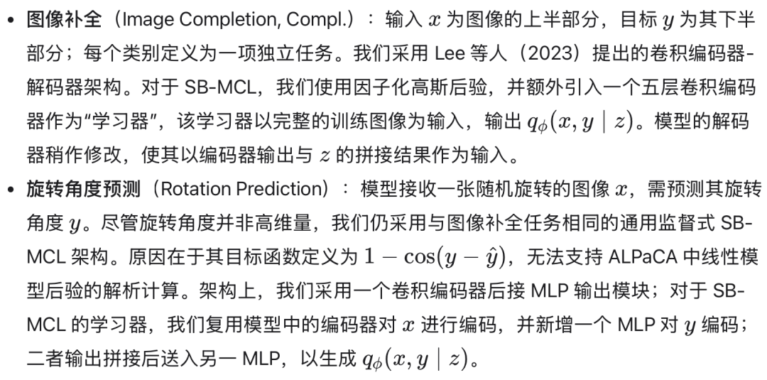 我们的实验设置主要沿用 Lee 等人(2023)的方案。由于广为使用的 Omniglot 数据集(Lake 等,2015)规模较小(仅含 1.6K 类 / 32K 张图像),易导致严重的元过拟合(meta-overfitting),Lee 等人转而重新利用 CASIA(Liu 等,2011)与 MS-Celeb-1M(Guo 等,2016)数据集开展 MCL 研究:CASIA 是一个中文手写字符数据集,包含 7.4K 种字符、共计 3.9M 张图像;MS-Celeb-1M 则包含 10 万位名人的 1000 万张图像。基于这些数据集,Lee 等人构建了多种监督学习基准任务,涵盖分类与回归两类任务;其中,每个类别(如字符类型或名人身份)被定义为一个独立任务。各基准任务的高层描述如下;各任务所用模型架构的可视化示意图见附录 B。