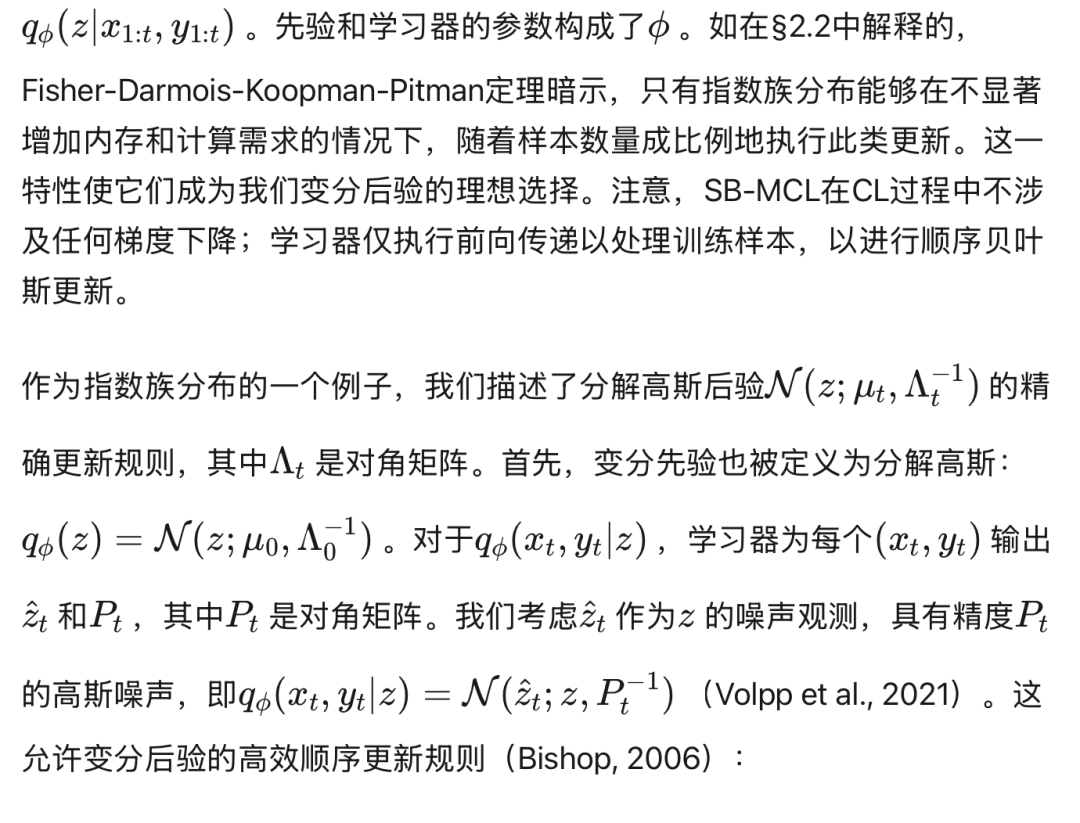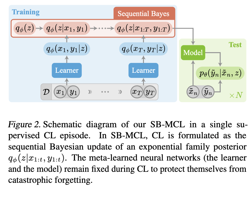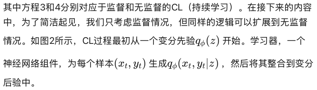在公式 1 和 2 中,CL 过程被抽象为变分后验分布 q_φ(z|D) 内部的过程,该分布是通过序贯贝叶斯更新获得的: