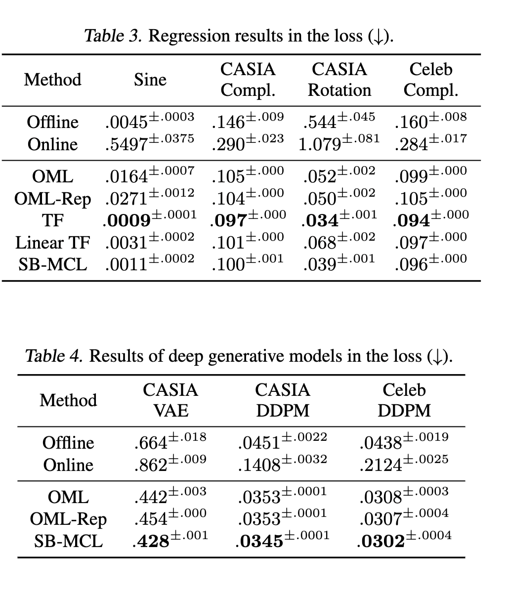 强大的持续学习性能 在分类、回归与生成任务的实验中(表 2–4),SB-MCL 家族显著优于基于 SGD 的方法及线性 Transformer(Linear TF);其性能可与标准 Transformer(TF)相媲美——但需注意,TF 的单样本计算开销随已学样本数持续增长。