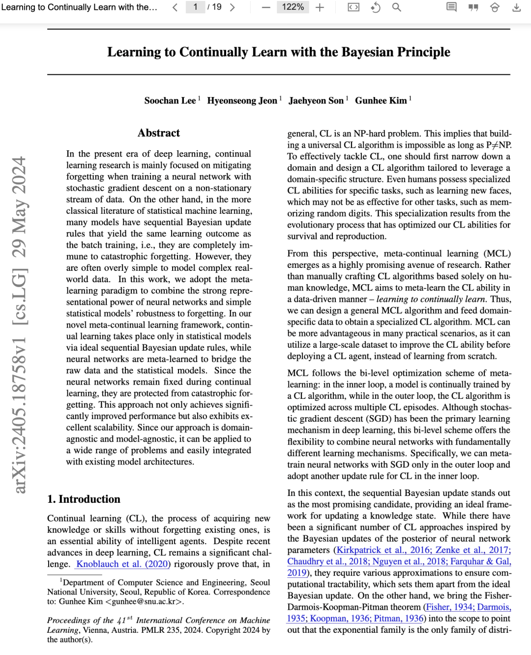 在当前深度学习时代,持续学习(continual learning)研究主要聚焦于:当使用随机梯度下降(SGD)在非平稳数据流上训练神经网络时,如何缓解灾难性遗忘(catastrophic forgetting)。另一方面,在更经典的统计机器学习文献中,许多模型具备序贯贝叶斯更新规则(sequential Bayesian update rules),其学习结果与批量训练(batch training)完全一致,即它们对灾难性遗忘完全免疫。然而,这类模型往往过于简单,难以建模复杂的现实世界数据。
