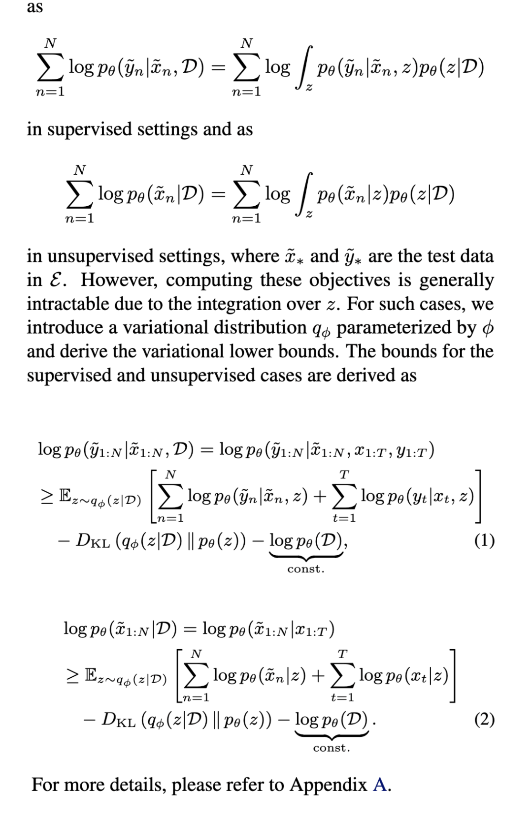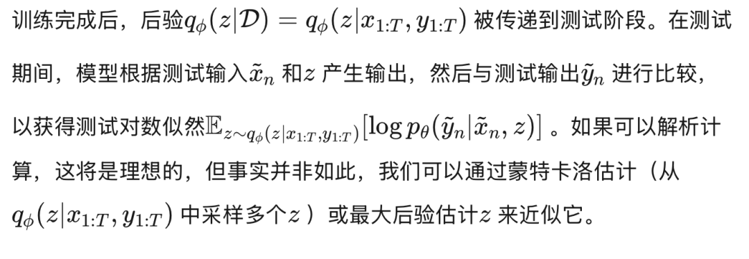 在给定 z 的条件下,我们在训练样本和测试样本上运行模型,以计算公式 1 或 2 中的第一项。该项鼓励模型与学习器协作,以提高数据的似然性。第二项是变分后验分布 qϕ(z∣D)与先验分布 pθ(z) 之间的 Kullback-Leibler (KL) 散度,可视为一项正则化项。我们将先验设定为与后验同属指数族的分布,例如,对于高斯后验,采用单位高斯分布作为先验,这使得 KL 散度可以进行解析计算。最后,最后一项 logpθ(D)是一个常数,在优化过程中可以忽略。