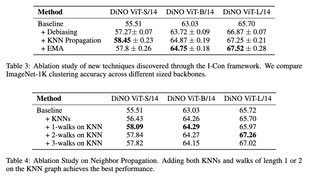 我们开展多项消融实验,以实证方式验证:通过 I-Con 框架分析对比聚类所衍生出的架构改进是否确有实效。这些消融实验聚焦两大关键方面: