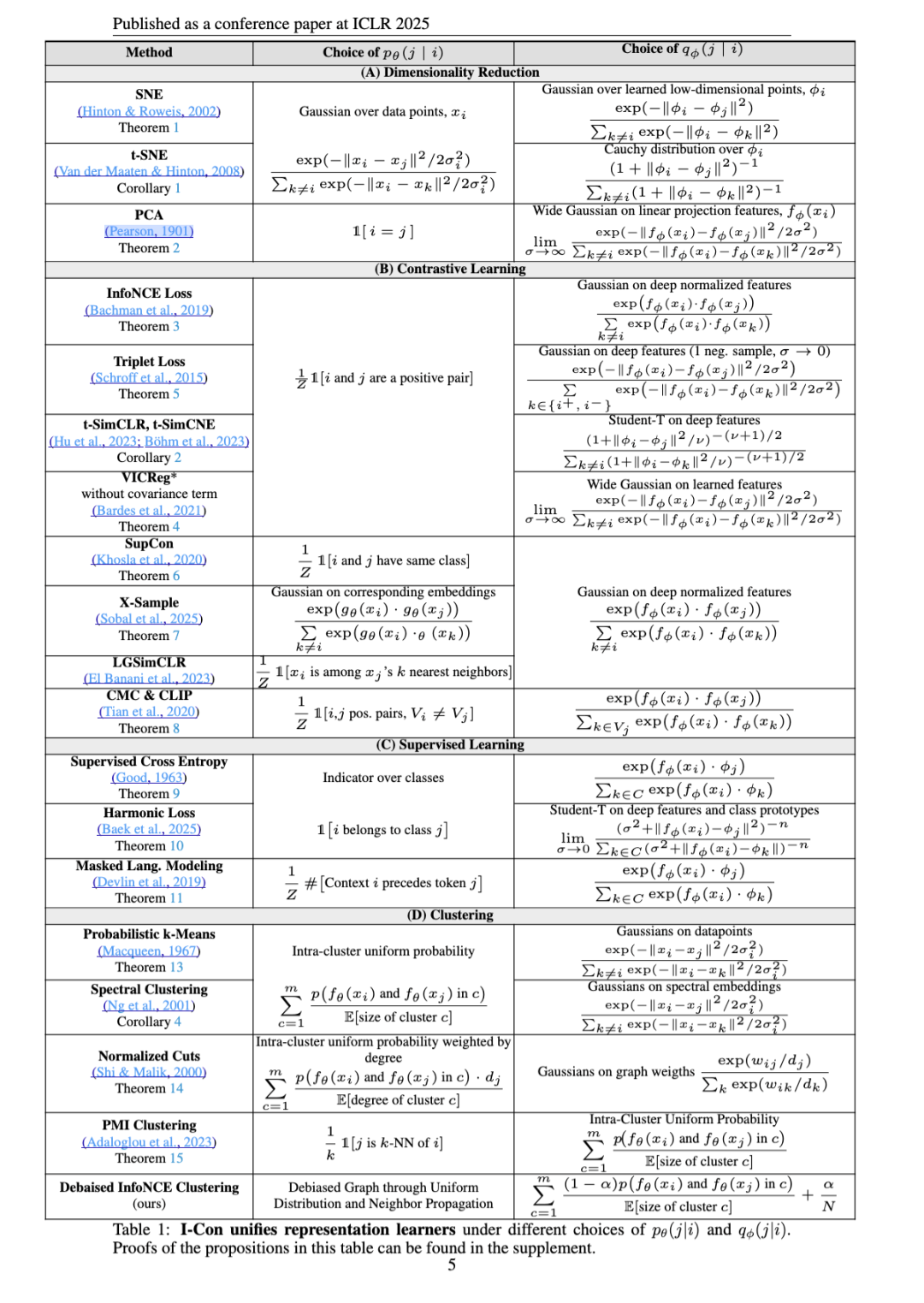 综上所述,我们提出了 I-Con:一个统一众大多类机器学习方法的单一信息论方程。我们提供了超过15个定理,严格证明该方程涵盖聚类、谱图理论、监督与无监督对比学习、降维,以及监督分类与回归等领域中最主流的损失函数。