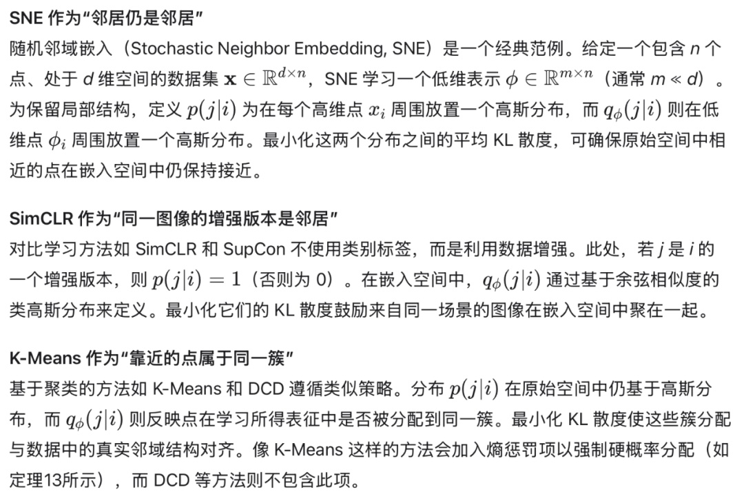 尽管 I-Con 统一了广泛的方法,我们仍通过具体示例说明:不同的 pp 与 qq 选择如何复现 SNE、SimCLR 和 k-Means 等经典技术。完整细节见附录。