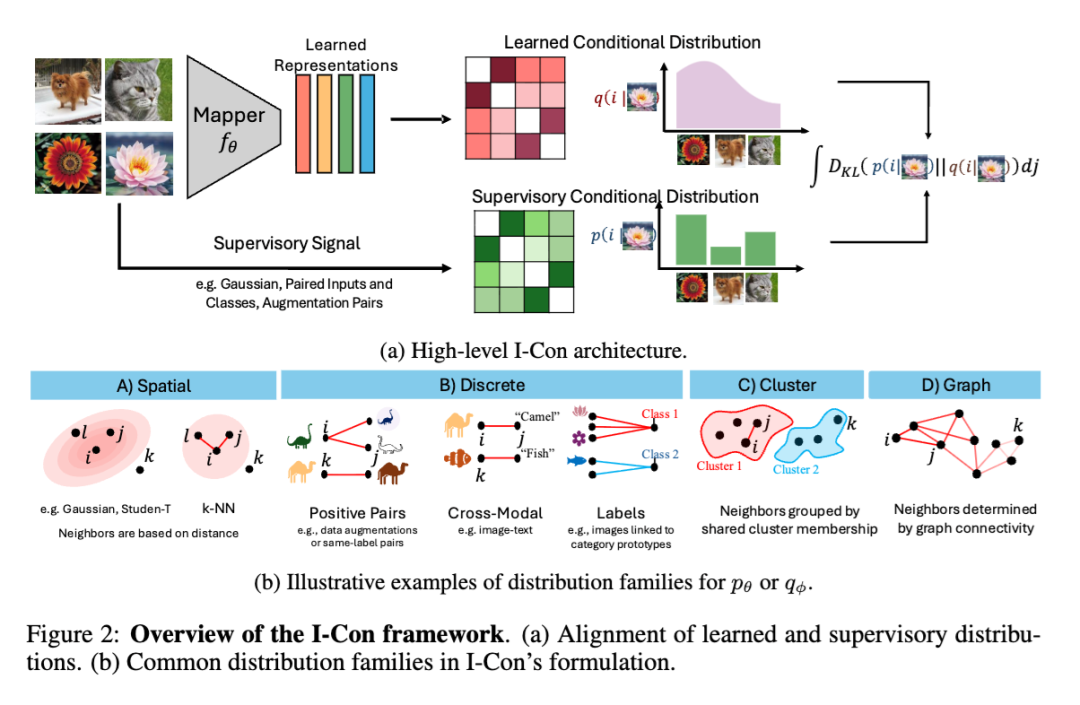 摘要 随着表征学习领域的发展,针对不同问题类别涌现出大量各异的损失函数。本文提出一个统一的信息论方程,可概括机器学习中众多现代损失函数。具体而言,我们构建了一个框架,揭示了多类广泛的机器学习方法实质上均在最小化两个条件分布——监督信号分布与学习所得表征分布——之间的积分KL散度(integrated KL divergence)。这一视角揭示了聚类、谱方法、降维、对比学习与监督学习背后共通的、潜在的信息几何结构。该框架使得我们能够通过组合文献中各类成功技术,设计新型损失函数。我们不仅提供了大量证明,将23种以上不同方法统一纳入该框架,还利用这些理论成果构建出当前最优的无监督图像分类器,在ImageNet-1K无监督分类任务上相较先前最优方法提升达+8%。此外,我们还证明:I-CON可用于推导具有理论依据的去偏方法,从而提升对比表征学习器的性能。