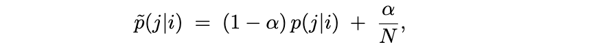 另一种理解该方法的视角是:它等价于采用尾部更重或分布更广(heavier-tailed or broader)的分布。通过引入均匀分量,我们复现了 t-SNE 中学生 t 分布(Van der Maaten & Hinton, 2008)的核心思想——即为更远的点分配更大质量。在这两种情形下,扩大分布范围均可降低模型对狭义定义的邻域过拟合的风险。