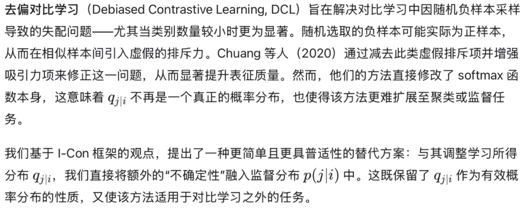 3.3 利用 I-Con 框架构建新型表征学习器 I-Con 框架将各类表征学习方法统一于一个统一的数学形式之下,并且关键在于,它促进了不同领域间技术的迁移与复用。 例如,对比学习中的某种技巧可应用于聚类任务——反之亦然。本文中,我们展示了:通过系统梳理现代表征学习方法,可开发出性能超越以往水平的聚类与无监督分类算法。 具体而言,我们融合了谱聚类、t-SNE 以及去偏对比学习(Chuang et al., 2020)的见解,构建出一种当前最先进的无监督图像分类流程。