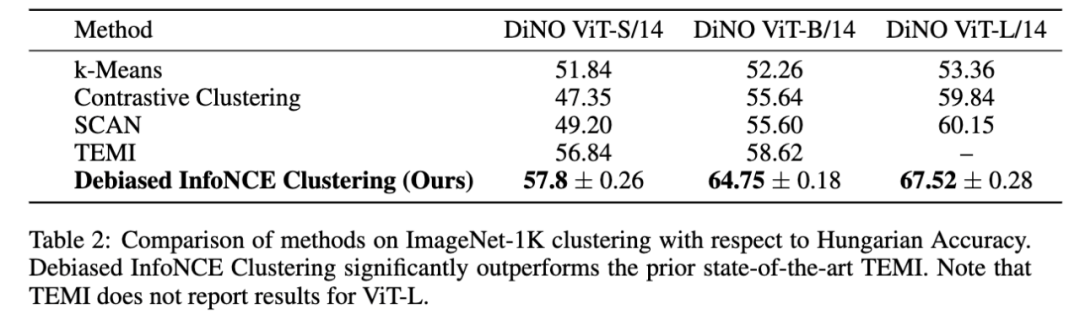 表 2 比较了去偏 InfoNCE 聚类(Debiased InfoNCE Clustering)在不同 DiNO 变体(ViT-S/14、ViT-B/14、ViT-L/14)以及若干其他现代聚类方法下的匈牙利匹配准确率(Hungarian accuracy)。I-Con 框架在所有模型规模下均持续优于此前的最先进方法。具体而言,在 DiNO ViT-B/14 与 ViT-L/14 模型上,去偏 InfoNCE 聚类相较于此前 ImageNet 聚类任务的最先进方法 TEMI,分别实现了 +4.5% 与 +7.8% 的匈牙利准确率提升。我们将这些改进主要归因于以下两点: