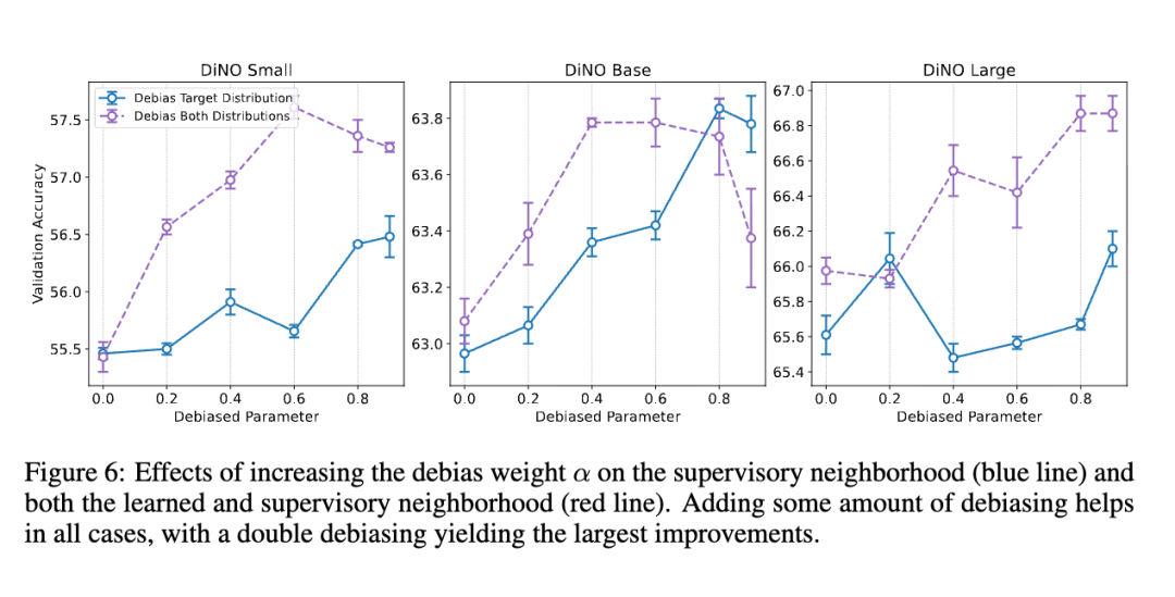 我们针对目标分布中不同强度的去偏(以参数 α 表示)开展实验,并测试以下配置:仅在目标侧应用去偏、在目标侧与学习表征侧双侧应用去偏,或完全不应用去偏。如图6所示,引入去偏可提升性能,且最优 α 值通常位于 0.6 至 0.8 区间——尤其当去偏同时施加于学习过程的双侧时效果最佳。该方法与对比学习中的去偏思想类似:即假设每个负样本均有非零概率(α/N)实为正样本(即标签错误)。图5进一步展示了 α 取值变化如何在不同批次大小下持续提升性能。