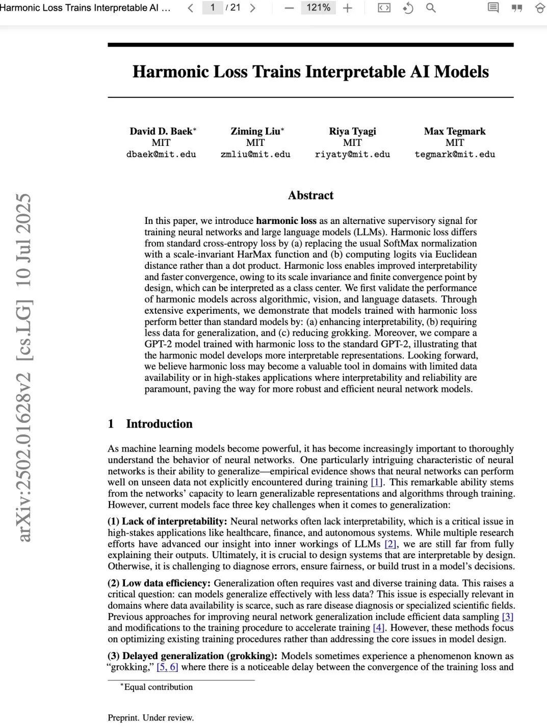 摘要 本文提出谐波损失(harmonic loss)作为一种替代性的监督信号,用于训练神经网络和大语言模型(LLMs)。谐波损失与标准交叉熵损失的主要区别在于:(a)以一种尺度不变(scale-invariant)的HarMax函数替代常规的SoftMax归一化;(b)通过欧氏距离而非点积计算logits。得益于其尺度不变性及设计上具有有限收敛点(可解释为类别中心)的特性,谐波损失能提升模型可解释性并加速收敛。我们首先在算法、视觉和语言任务数据集上验证谐波模型的性能。大量实验表明,采用谐波损失训练的模型相较于标准模型具有以下优势:(a)增强可解释性;(b)实现泛化所需训练数据更少;(c)减轻“顿悟”(grokking)现象。此外,我们对比了采用谐波损失训练的GPT-2模型与标准GPT-2模型,结果表明前者习得的表征更具可解释性。展望未来,我们认为谐波损失有望成为数据稀缺领域或对可解释性与可靠性要求极高的高风险应用中的有力工具,从而推动构建更稳健、高效的神经网络模型。