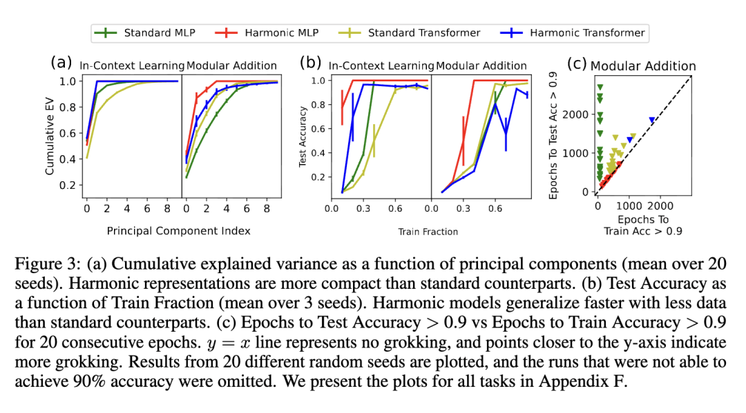 图3(a)进一步表明,谐波表征比标准模型的表征更紧凑,包含更少不可解释的成分。特别是,在上下文内学习任务中训练的谐波模型,仅使用前两个主成分即可达到100%的解释方差。