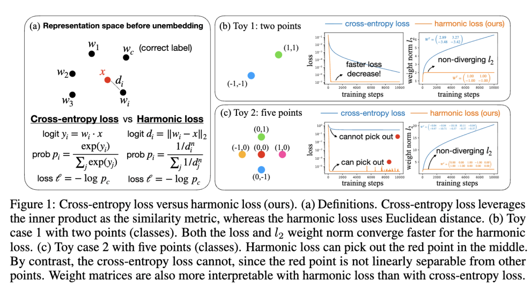 正如俗语所言:“魔鬼藏在SoftMax中。”我们认为,上述三大挑战部分源于交叉熵损失(用于分类任务)中SoftMax函数的广泛使用。因此,本文提出谐波损失作为替代方案。谐波损失具备两个理想的数学性质——(1)尺度不变性;(2)具有有限收敛点(可阐释为类别中心)——从而促进更快收敛并提升可解释性。通过全面实验,我们证实:采用谐波损失训练的模型能有效减轻顿悟现象、降低数据需求,并增强可解释性。进一步地,我们将谐波损失训练的GPT-2与标准GPT-2进行对比,发现前者习得的表征更具可解释性。