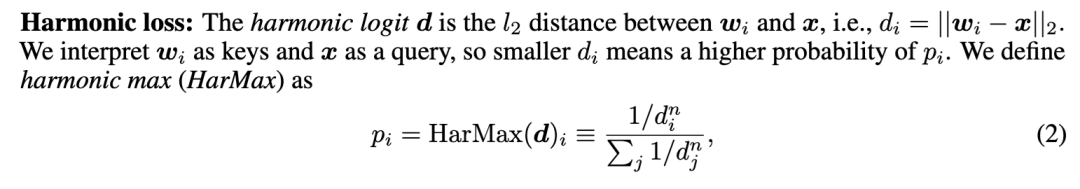 其中 n(谐波指数)是一个控制概率分布重尾程度的超参数。若真实类别标签为 c,则损失 ℓ = -log p_c。为简化符号,我们将与谐波损失结合的层称为谐波层。由于两种损失的最后一部相同(ℓ = -log p),比较它们的值是有意义的。二者仅在从表征计算概率的方式上有所不同。
