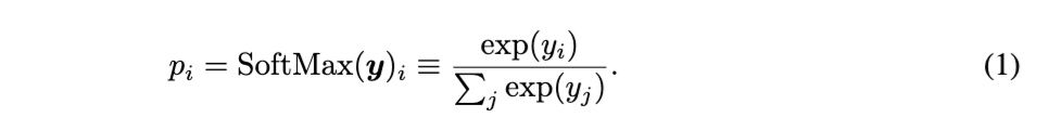 交叉熵损失:Logits y 定义为矩阵-向量乘法,即 y = Wᵀx ∈ ℝⱽ(忽略偏置项),或写作 yᵢ = wᵢ · x,其中 wᵢ 是 W 的第 i 列。概率 p 可通过对 y 应用 SoftMax 函数获得,即: