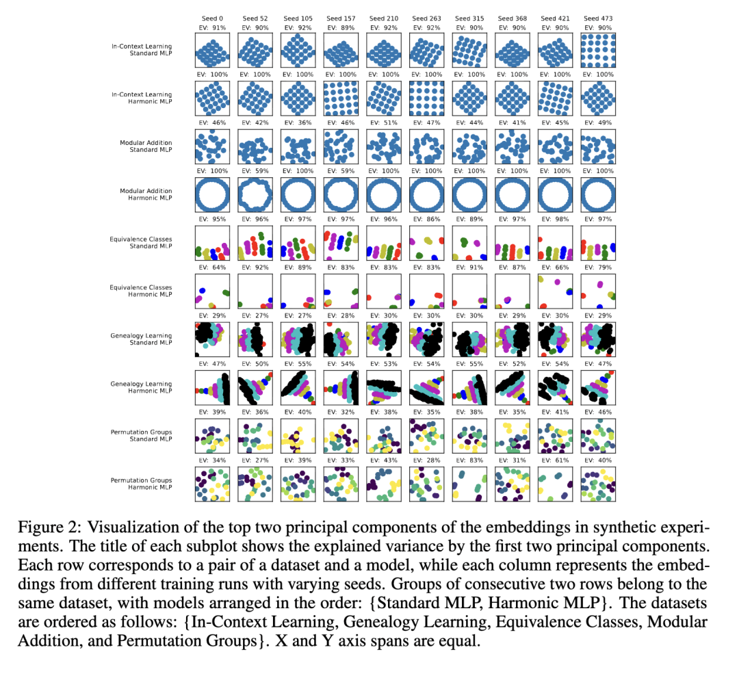 图2展示了MLP任务中各模型嵌入向量的前两个主成分的可视化图。所有任务的完整嵌入可视化结果见附录A。总体而言,采用谐波损失得到的表征比交叉熵损失对应的表征更清晰、更有条理。我们发现:在模加法任务中,表征几乎完美地呈现为圆形;在家谱树学习任务中,呈现出清晰的塔状结构;在置换合成任务中,则形成整齐的聚类。以下我们逐项分析各任务中的表征: