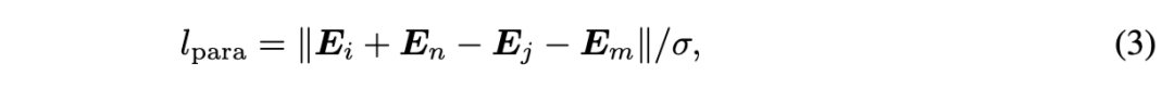 为构造平行四边形,我们可以从数据集中抽取两组不同的词对,得到类似 (jump, jumped, fasten, fastened) 的四元组,这些四元组预期应构成平行四边形。每个词被分词为若干词元;若得到多个词元,则取最后一个词元。我们将词元嵌入投影至前两个主成分空间。对于四元组 (i, j, m, n),其二维主成分嵌入为 (Eᵢ, Eⱼ, Eₘ, Eₙ);我们定义平行四边形损失