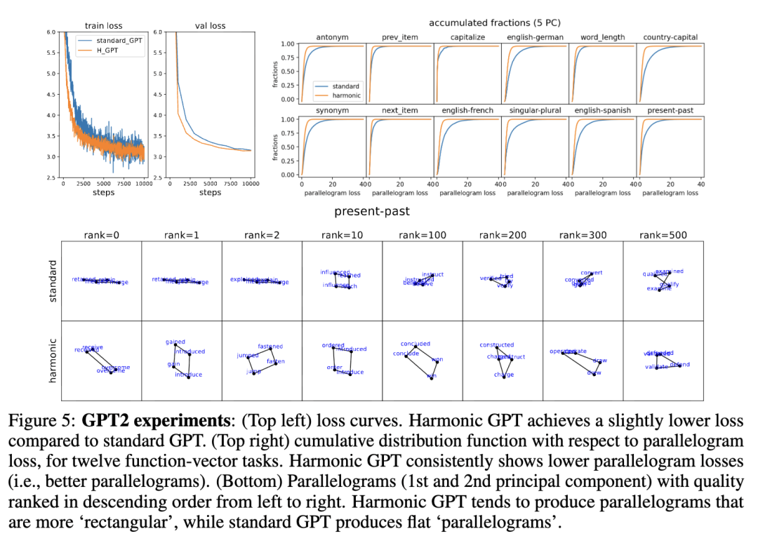 )。我们获得了10000个四元组,通过计算它们的平行四边形损失来衡量平行四边形的质量。我们在图5右上角绘制了它们的累积分布函数:对于每一项任务,谐波GPT产生的平行四边形损失(即更好的平行四边形)低于标准GPT。我们在图5底部展示了在当前-过去任务中获得的平行四边形。平行四边形按质量从左到右降序排列。谐波GPT倾向于生成视觉上更吸引人的、更“矩形”的平行四边形,而标准GPT则生成扁平的“平行四边形”。关于内部表示的讨论包含在附录C中。