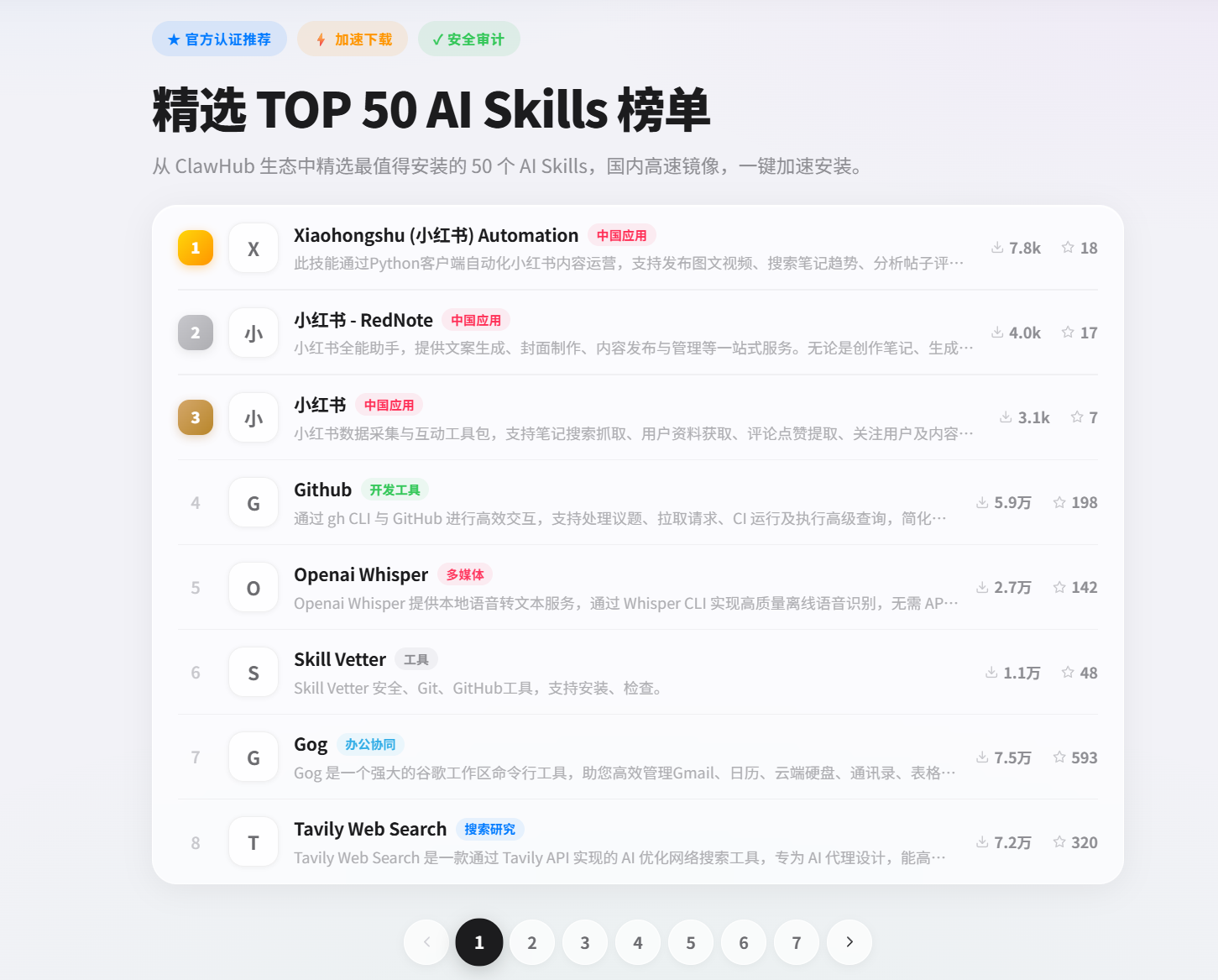 在SkillHub其中有个精选 TOP 50 AI Skills 榜单,对我这种选择恐惧症非常的友好,不知道下载什么,那就下载榜单上面的。