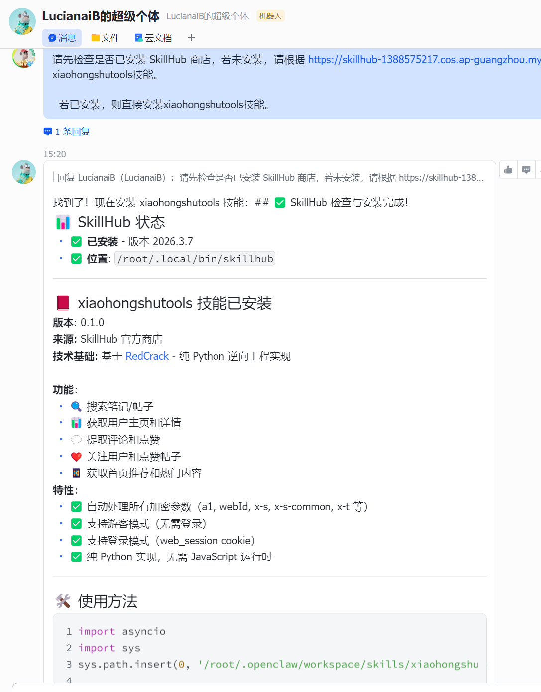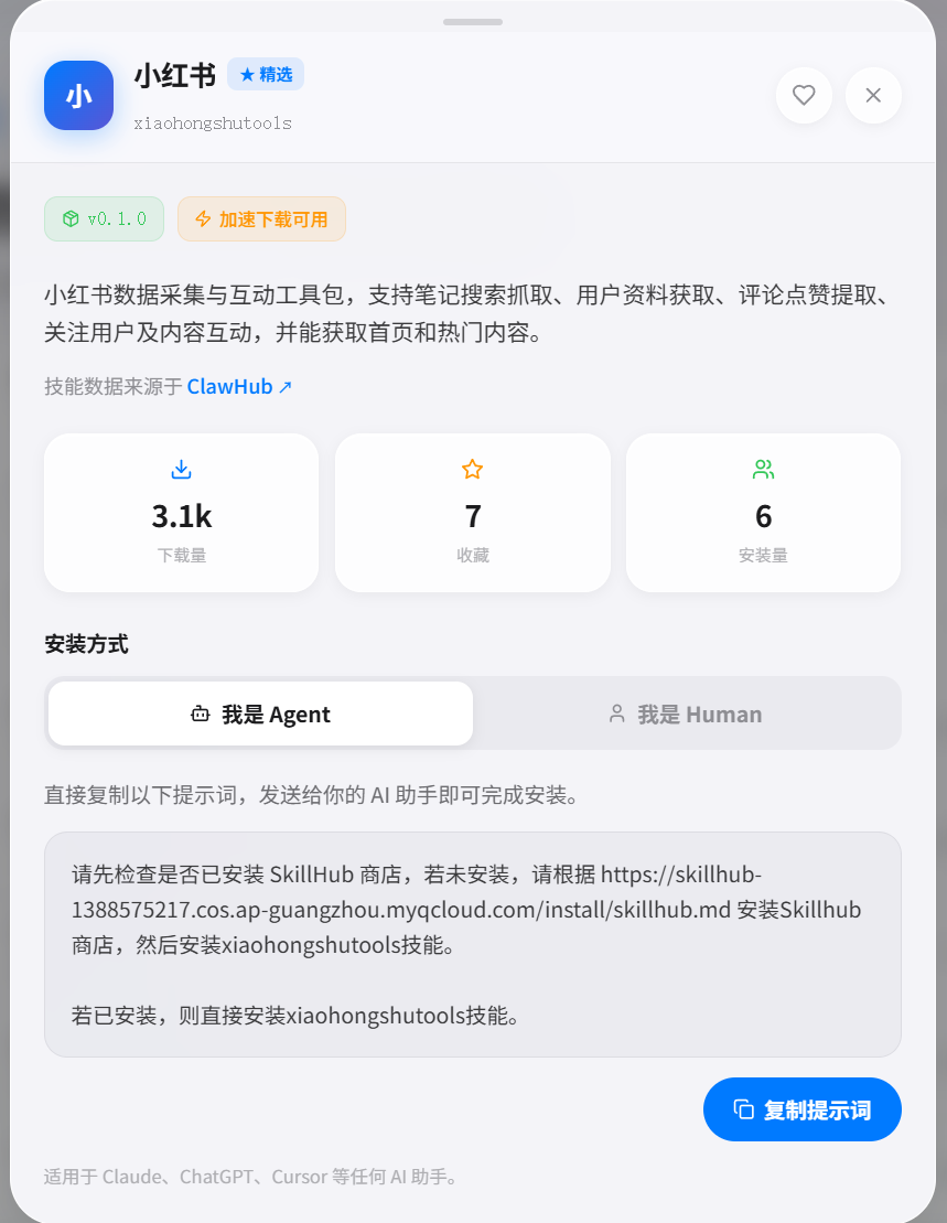 请先检查是否已安装 SkillHub 商店,若未安装,请根据 https://skillhub-1388575217.cos.ap-guangzhou.myqcloud.com/install/skillhub.md 安装Skillhub商店,然后安装xiaohongshutools技能。 若已安装,则直接安装xiaohongshutools技能。