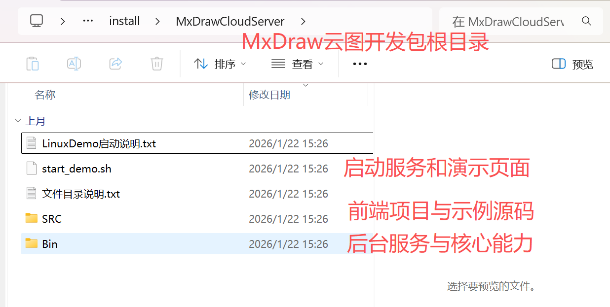 MXDRAWCLOUDSERVER1.0_XXX_xxx_TRYVERSION (其中XXX为云图开发包版本号,xxx为对应的操作系统) └─ install └─ MxDrawCloudServer (云图开发包根目录)