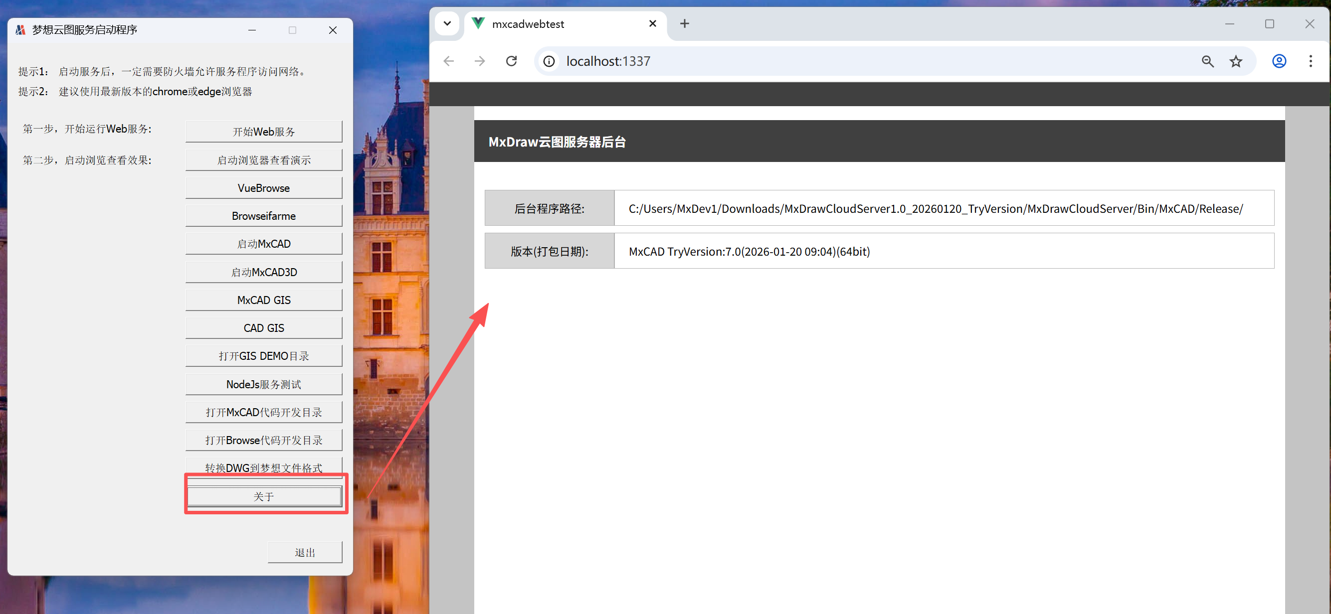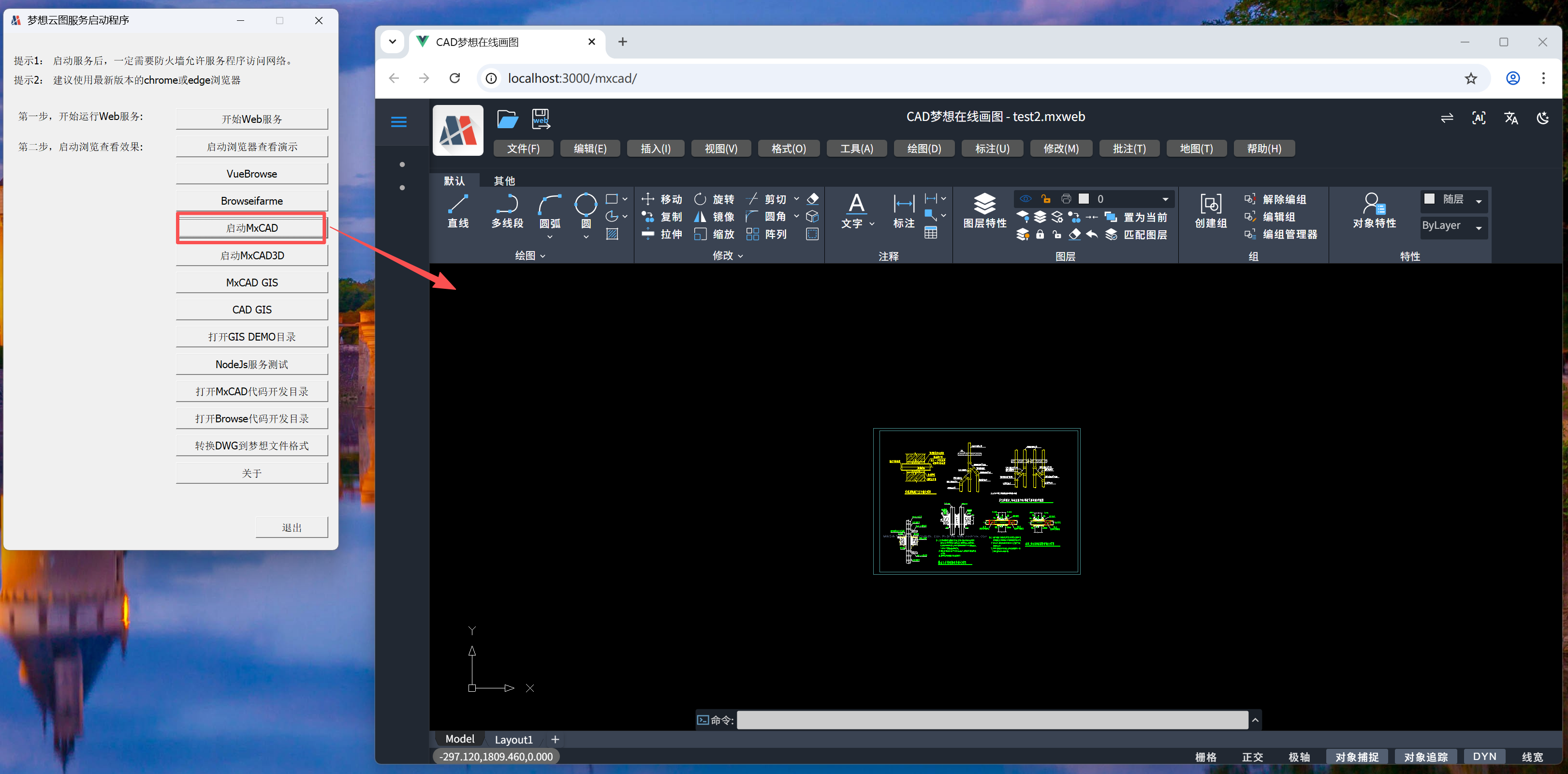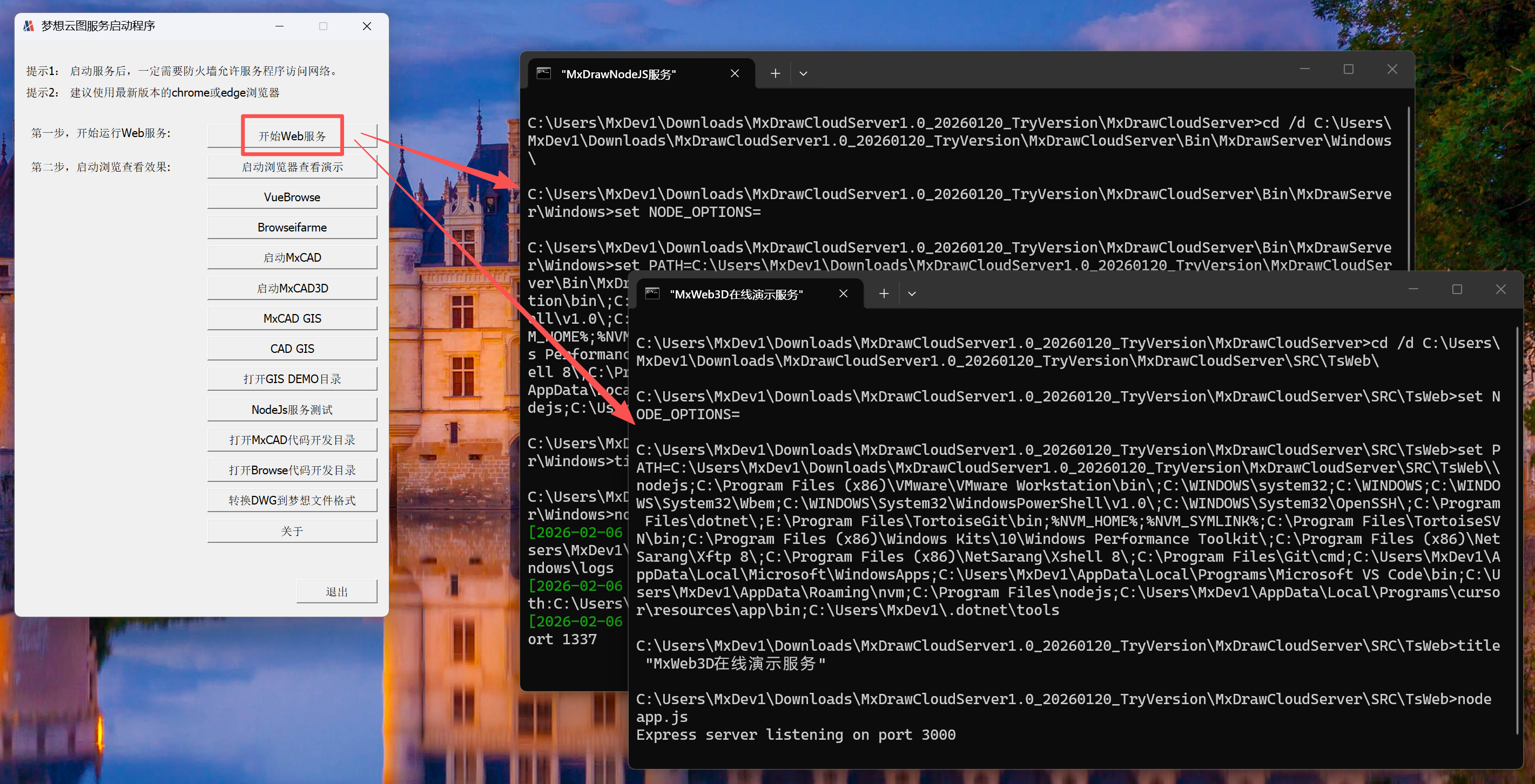 当你点击 “开启Web服务” 按钮时,MxDraw 会自动启动两个关键的本地服务程序。这两个服务协同工作,共同支撑起完整的在线 CAD 功能体验。