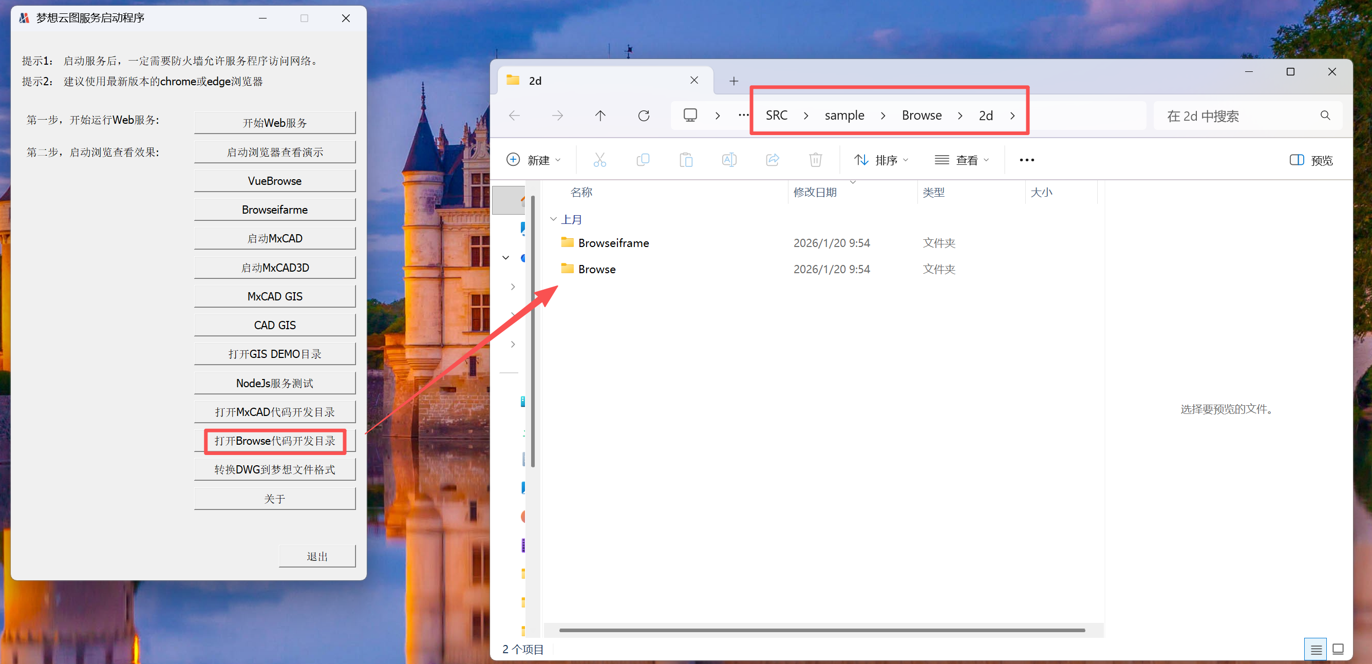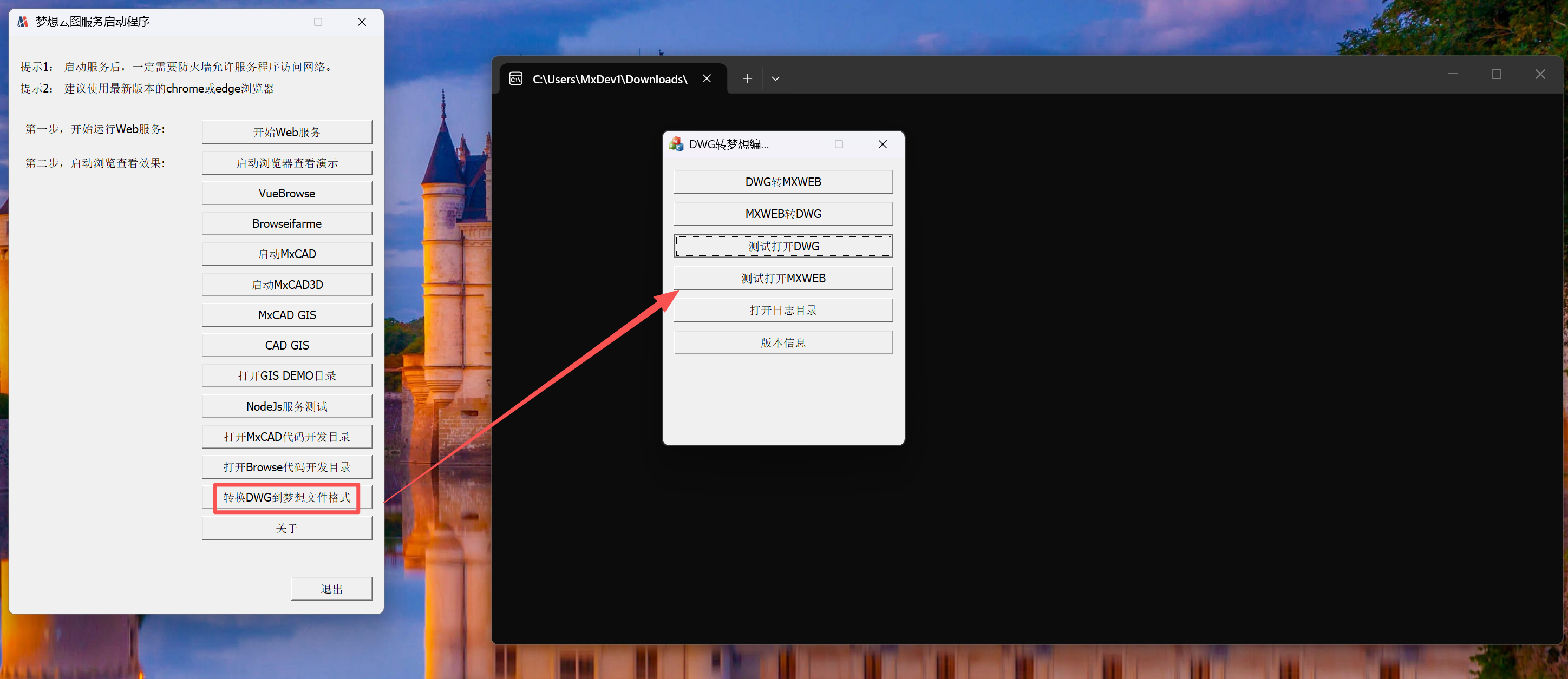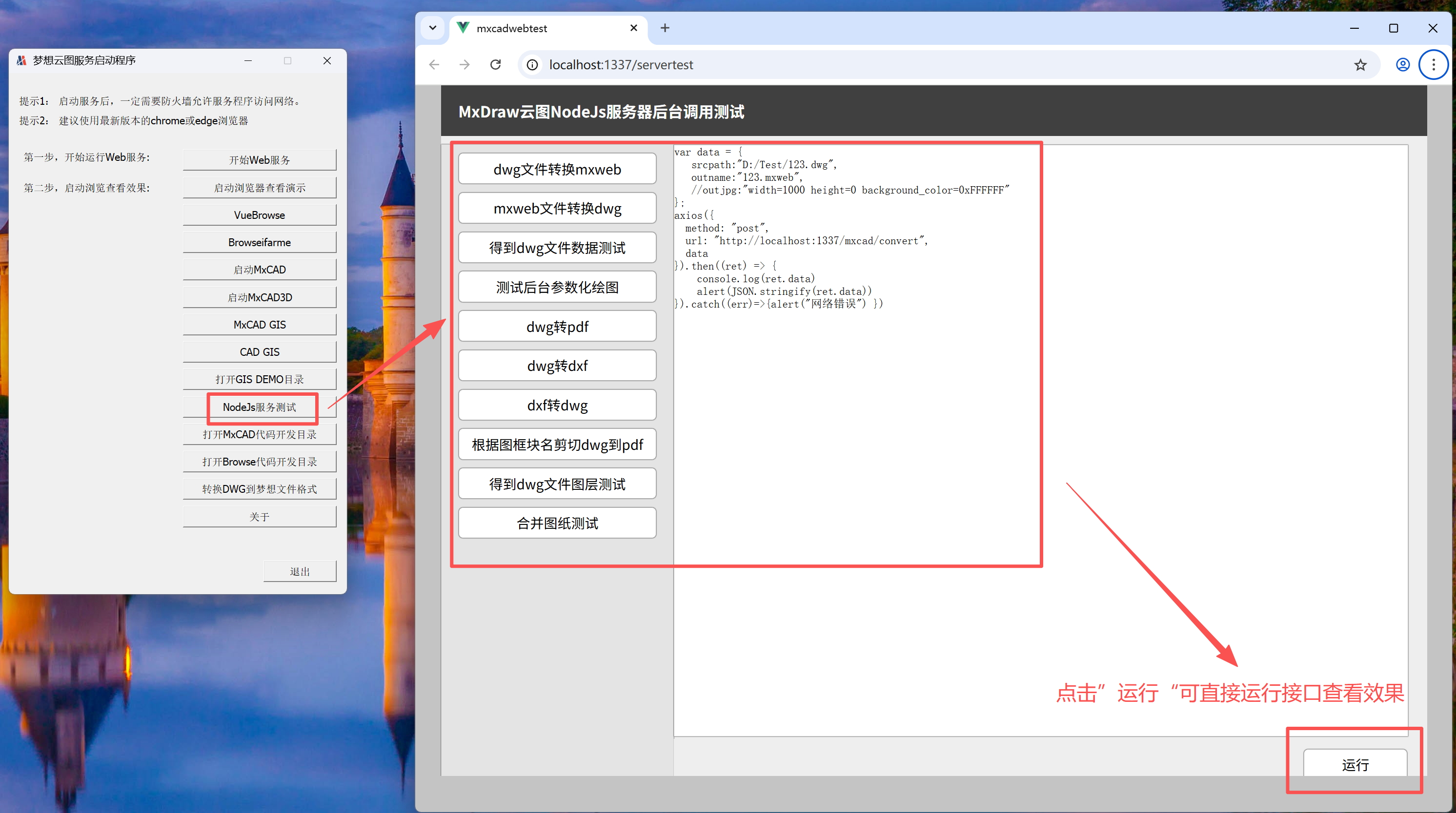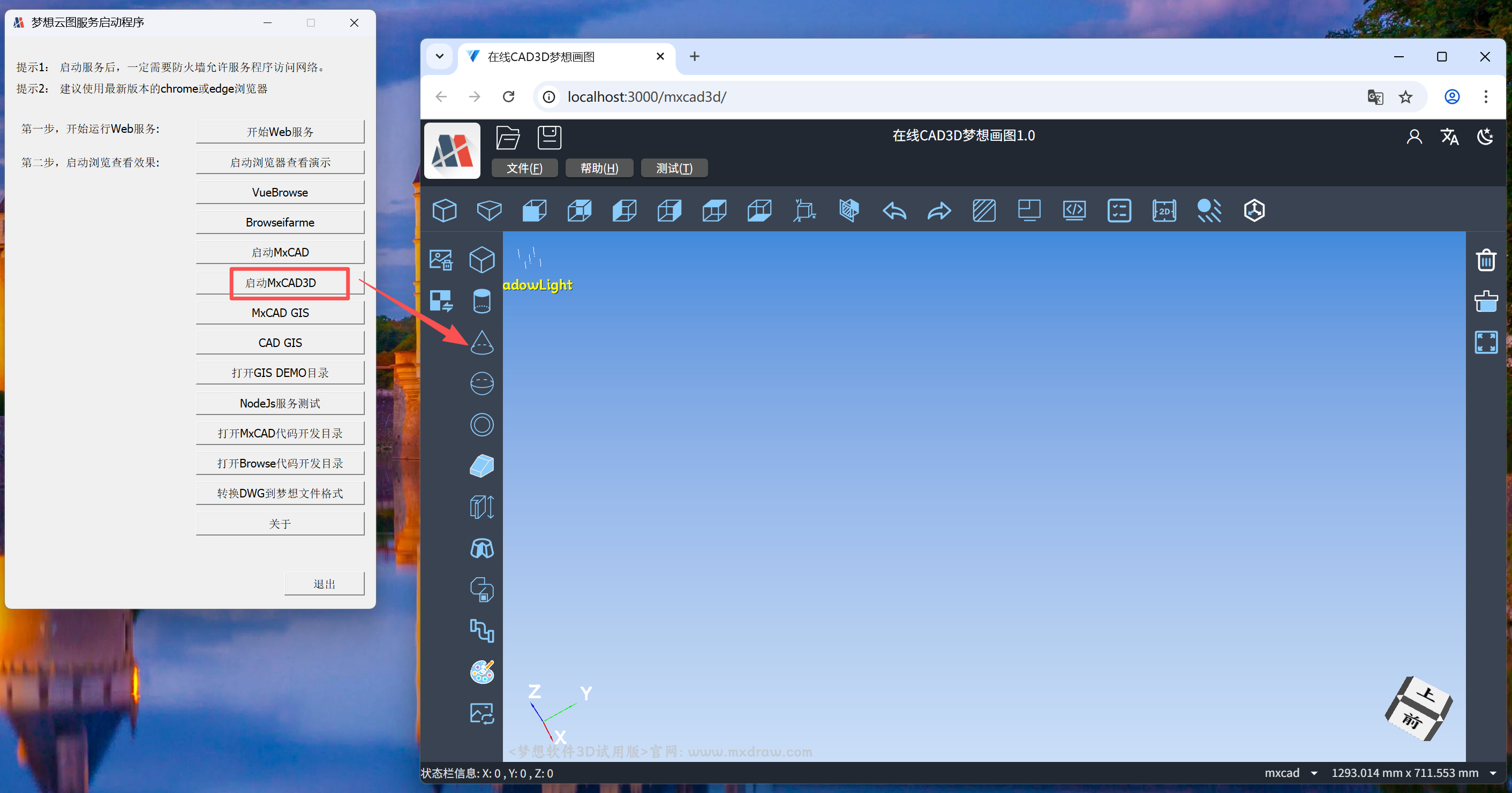 当你点击 “开启Web服务” 按钮时,MxDraw 会自动启动两个关键的本地服务程序。这两个服务协同工作,共同支撑起完整的在线 CAD 功能体验。