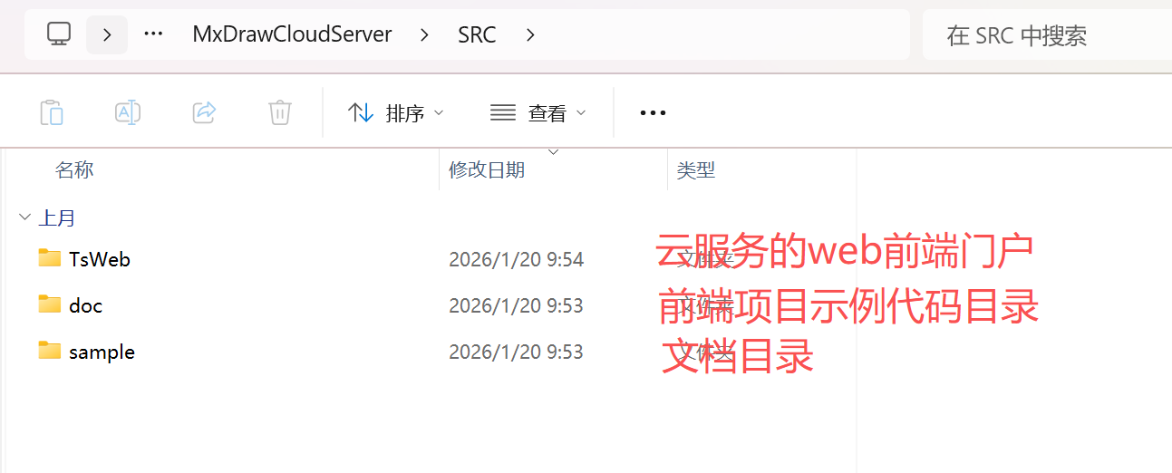 MxDrawCloudServer └─ SRC └─ sample (前端项目示例代码目录) └─ TsWeb (云服务的web前端门户) └─ doc (文档目录)